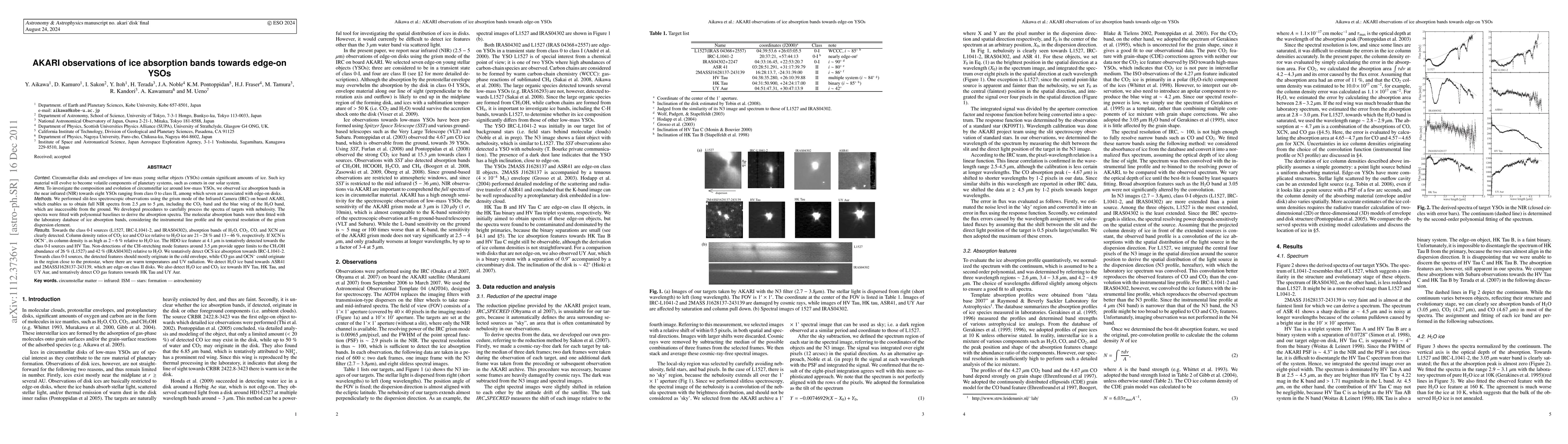 To investigate the composition and evolution of circumstellar ice around low-mass YSOs, we observed ice absorption bands in the near infrared (NIR) towards eight YSOs ranging from class 0 to class II, among which seven are associated with edge-on disks. We performed slit-less spectroscopic observations using the grism mode of the Infrared Camera (IRC) on board AKARI, which enables us to obtain full NIR spectra from 2.5 $\mu$m to 5 $\mu$m. The spectra were fitted with polynomial baselines to derive the absorption spectra. The molecular absorption bands were then fitted with the laboratory database of ice absorption bands, considering the instrumental line profile and the spectral resolution of the grism dispersion element. Towards the class 0-I sources (L1527, IRC-L1041-2, and IRAS04302), absorption bands of H$_2$O, CO$_2$, CO, and XCN are clearly detected. Column density ratios of CO$_2$ ice and CO ice relative to H$_2$O ice are 21-28% and 13-46%, respectively. If XCN is OCN$^-$, its column density is as high as 2-6% relative to H$_2$O ice. The HDO ice feature at 4.1 $\mu$m is tentatively detected towards the class 0-I sources and HV Tau. Non-detections of the CH-stretching mode features around 3.5 $\mu$m provide upper limits to the CH$_3$OH abundance of 26% (L1527) and 42% (IRAS04302) relative to H$_2$O. We tentatively detect OCS ice absorption towards IRC-L1041-2. Towards class 0-I sources, the detected features should mostly originate in the cold envelope, while CO gas and OCN$^-$ could originate in the region close to the protostar, where there are warm temperatures and UV radiation. We detect H$_2$O ice band towards ASR41 and 2MASSJ1628137-243139, which are edge-on class II disks. We also detect H$_2$O ice and CO$_2$ ice towards HV Tau, HK Tau, and UY Aur, and tentatively detect CO gas features towards HK Tau and UY Aur.