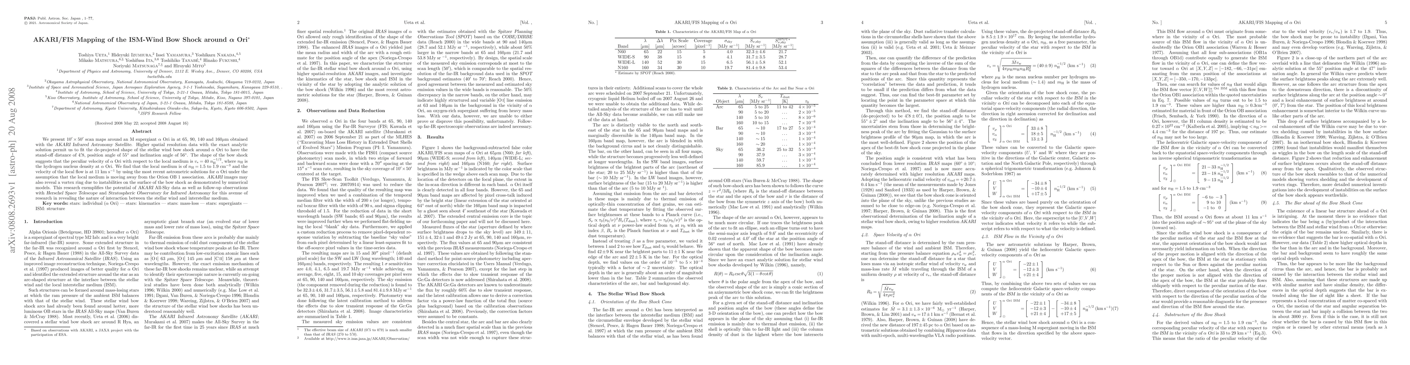 We present 10' x 50' scan maps around an M supergiant Alpha Ori at 65, 90, 140 and 160 microns obtained with the AKARI Infrared Astronomy Satellite. Higher spatial resolution data with the exact analytic solution permit us to fit the de-projected shape of the stellar wind bow shock around Alpha Ori to have the stand-off distance of 4.8', position angle of 55 degrees and inclination angle of 56 degrees. The shape of the bow shock suggests that the peculiar velocity of Alpha Ori with respect to the local medium is v_* = 40 (n_H)^(-1/2), where n_H is the hydrogen nucleus density at Alpha Ori. We find that the local medium is of n_H = 1.5 to 1.9 cm^(-3) and the velocity of the local flow is at 11 km s^(-1) by using the most recent astrometric solutions for Alpha Ori under the assumption that the local medium is moving away from the Orion OB 1 association. AKARI images may also reveal a vortex ring due to instabilities on the surface of the bow shock as demonstrated by numerical models. This research exemplifies the potential of AKARI All-Sky data as well as follow-up observations with Herschel Space Telescope and Stratospheric Observatory for Infrared Astronomy for this avenue of research in revealing the nature of interaction between the stellar wind and interstellar medium.