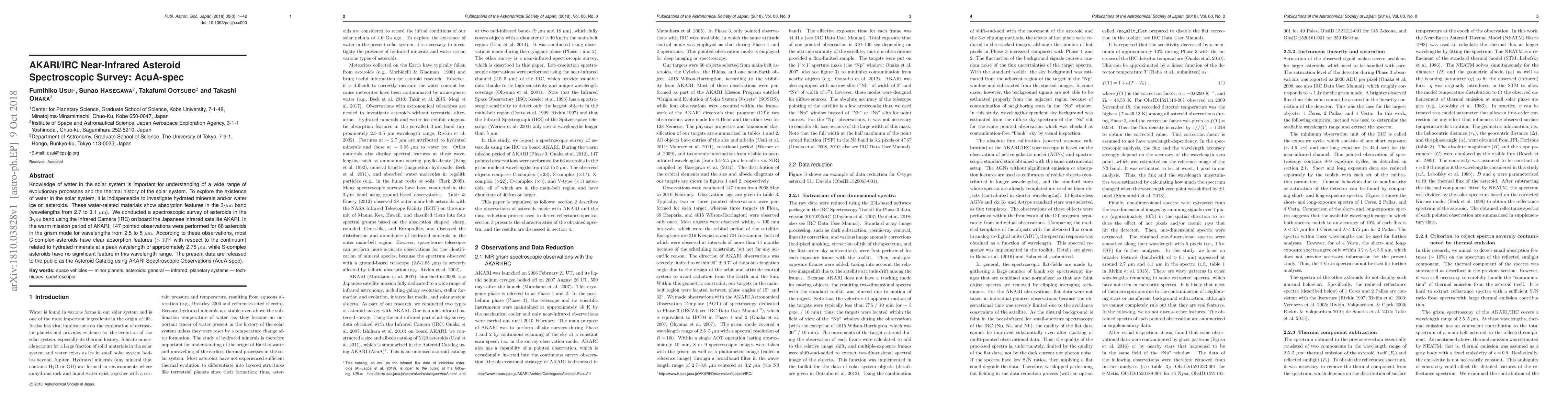 This study conducted a near-infrared spectroscopic survey of 66 asteroids using AKARI's IRC, revealing that most C-complex asteroids exhibit strong absorption features indicative of hydrated minerals, while S-complex asteroids show no such features. The findings enhance our understanding of water's role in the solar system's evolution.