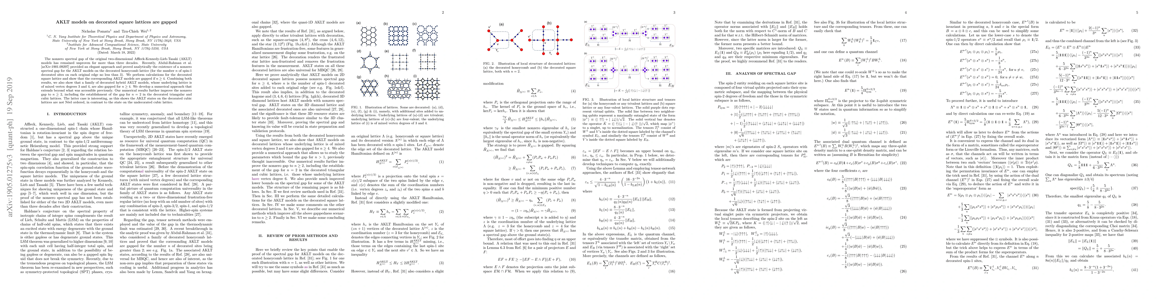This paper proves the existence of a nonzero spectral gap for AKLT models on decorated square lattices when the number of spin-1 decorated sites is $n\ge 4$. It extends previous results to show that similar models on decorated triangular and cubic lattices also have a gap for $n\ge 2$, revealing that AKLT states on decorated cubic lattices are not N\'eel ordered.