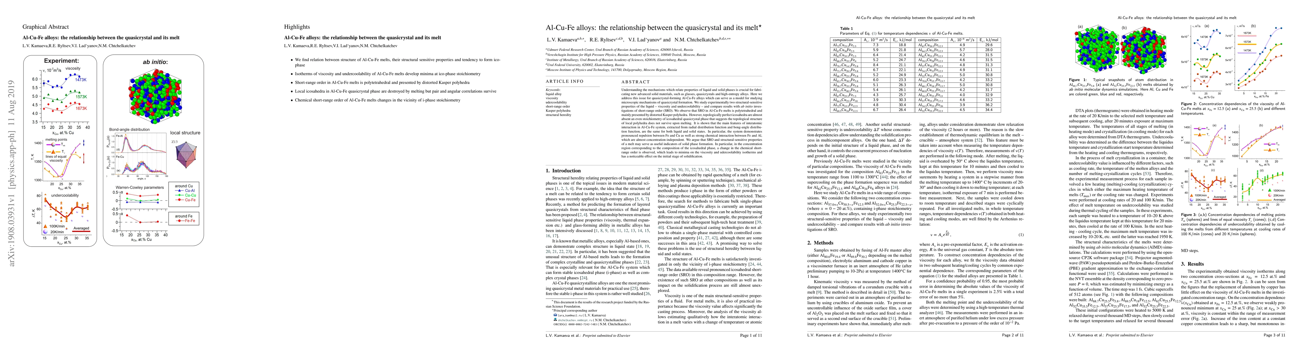 Understanding the mechanisms which relate properties of liquid and solid phases is crucial for fabricating new advanced solid materials, such as glasses, quasicrystals and high-entropy alloys. Here we address this issue for quasicrystal-forming Al-Cu-Fe alloys which can serve as a model for studying microscopic mechanisms of quasicrystal formation. We study experimentally two structural-sensitive properties of the liquid -- viscosity and undercoolability -- and compare results with \textit{ab initio} investigations of short-range order (SRO). We observe that SRO in Al-Cu-Fe melts is polytetrahedral and mainly presented by distorted Kasper polyhedra. However, topologically perfect icosahedra are almost absent an even stoichiometry of icosahedral quasicrystal phase that suggests the topological structure of local polyhedra does not survive upon melting. It is shown that the main features of interatomic interaction in Al-Cu-Fe system, extracted from radial distribution function and bong-angle distribution function, are the same for both liquid and solid states. In particular, the system demonstrates pronounced repulsion between Fe and Cu as well as strong chemical interaction between Fe and Al, which are almost concentration-independent. We argue that SRO and structural-sensitive properties of a melt may serve as useful indicators of solid phase formation. In particular, in the concentration region corresponding to the composition of the icosahedral phase, a change in the chemical short-range order is observed, which leads to minima on the viscosity and udercoolability isotherms and has a noticeable effect on the initial stage of solidification.