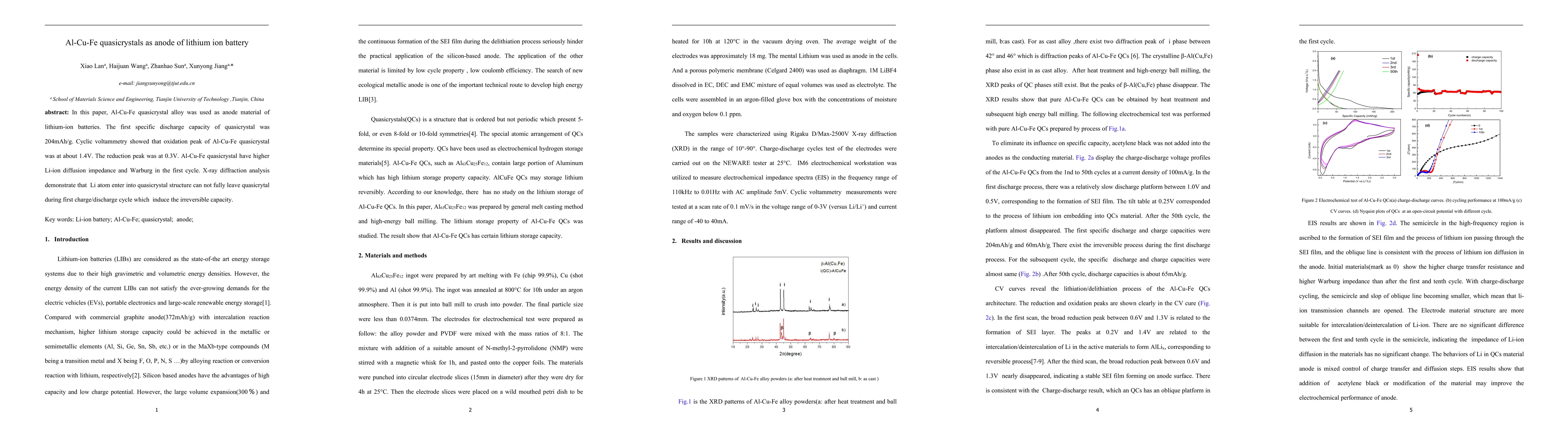 This study explores Al-Cu-Fe quasicrystal alloy as a novel anode material for lithium-ion batteries, achieving a first specific discharge capacity of 204mAh/g. However, the material exhibits higher Li-ion diffusion impedance and irreversible capacity due to Li atoms not fully leaving the quasicrystal structure during the first charge/discharge cycle.