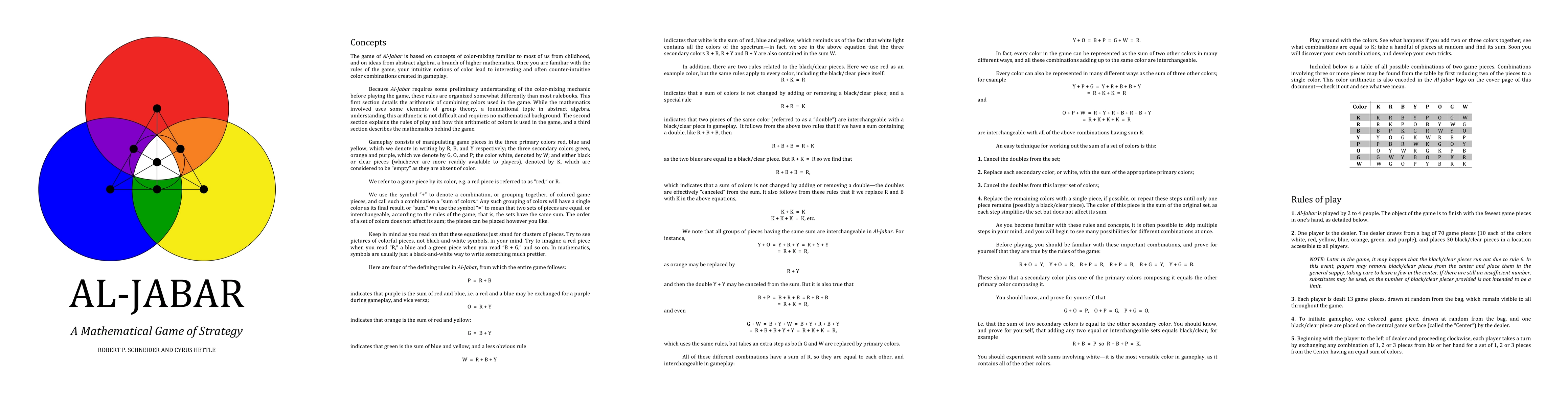 We detail the rules and mathematical structure of Al-Jabar, a game invented by the authors based on intuitive concepts of color-mixing and ideas from abstract algebra. Game-play consists of manipulating colored game pieces; we discuss how these colored pieces form a group structure and how this structure, along with an operation used to combine the pieces, is used to create a game of strategy. We also consider extensions of the game rules to other group structures. Note: While this is an article for general readership originally published online by Gathering for Gardner in honor of Martin Gardner's birthday (Oct. 2011), Al-Jabar has been played in university abstract algebra courses as a teaching tool, as well as by game enthusiasts, since its release. Moreover, the algebraic game structure described has sparked further work by other mathematicians and game designers. Thus, we submit this article to the ArXiV as a resource for educators as well as those interested in mathematical games.