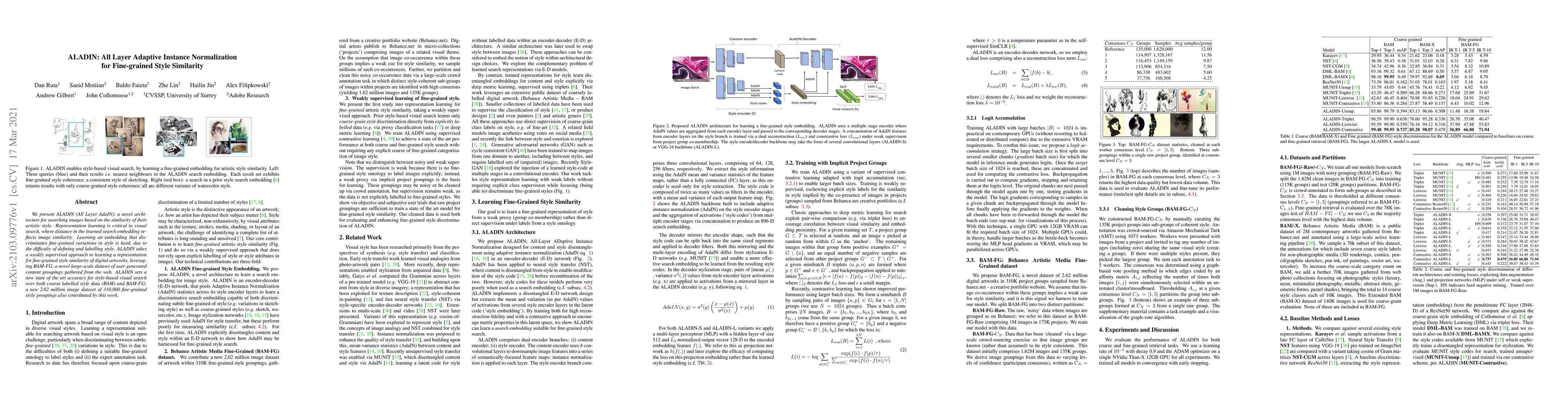 ALADIN employs All Layer Adaptive Instance Normalization for fine-grained style similarity in visual search, achieving state-of-the-art accuracy using a weakly supervised approach and a new large-scale dataset, BAM-FG, of fine-grained style groupings.