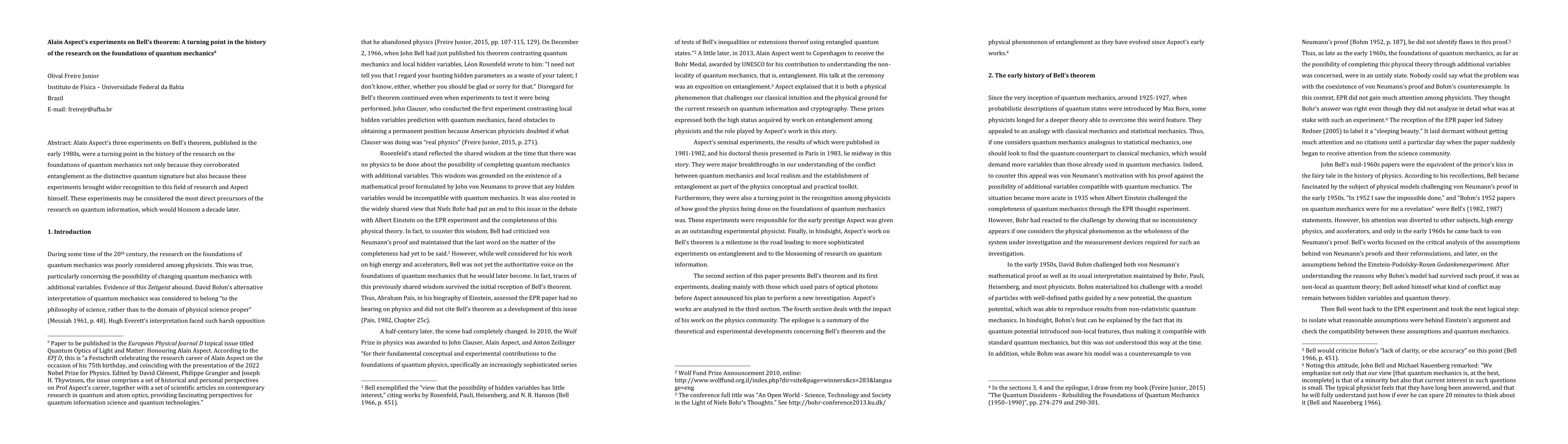 Alain Aspect's three experiments on Bell's theorem, published in the early 1980s, were a turning point in the history of the research on the foundations of quantum mechanics not only because they corroborated entanglement as the distinctive quantum signature but also because these experiments brought wider recognition to this field of research and Aspect himself. These experiments may be considered the most direct precursors of the research on quantum information, which would blossom a decade later.
