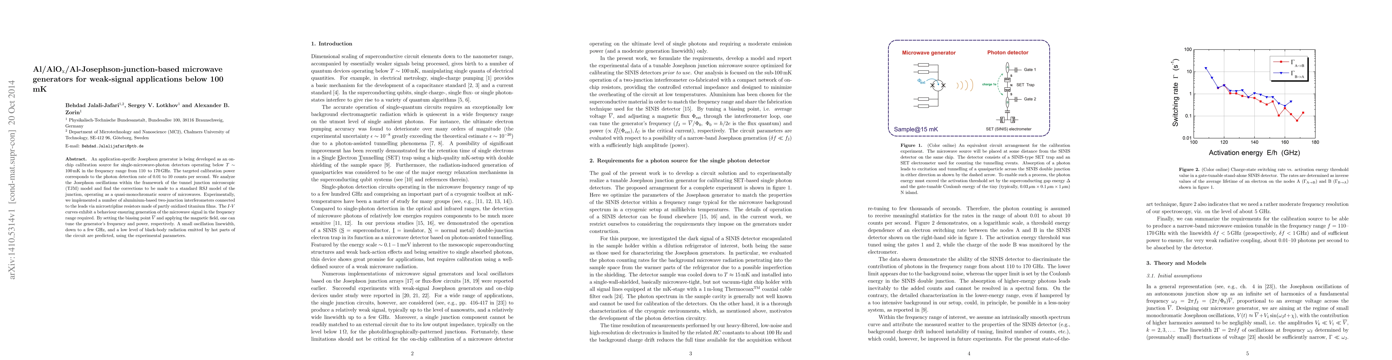 An application-specific Josephson generator is being developed as an on-chip calibration source for single-microwave-photon detectors operating below $T \sim $100 mK in the frequency range from 110 to 170 GHz. The targeted calibration power corresponds to the photon detection rate of 0.01 to 10 counts per second. We analyze the Josephson oscillations within the framework of the tunnel junction microscopic (TJM) model and find the corrections to be made to a standard RSJ model of the junction, operating as a quasi-monochromatic source of microwaves. Experimentally, we implemented a number of aluminium-based two-junction interferometers connected to the leads via microstripline resistors made of partly oxidized titanium films. The $I$-$V$ curves exhibit a behaviour ensuring generation of the microwave signal in the frequency range required. By setting the biasing point $\bar{V}$ and applying the magnetic field, one can tune the generator's frequency and power, respectively. A small oscillation linewidth, down to a few GHz, and a low level of black-body radiation emitted by hot parts of the circuit are predicted, using the experimental parameters.