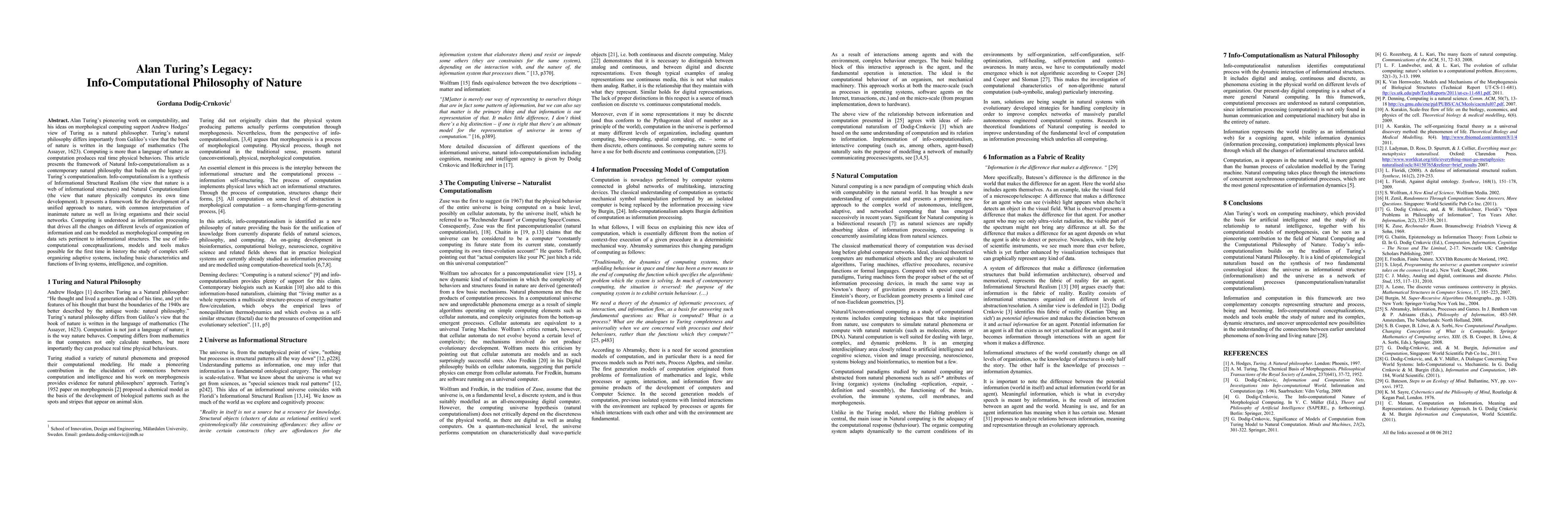 Alan Turing's pioneering work on computability, and his ideas on morphological computing support Andrew Hodges' view of Turing as a natural philosopher. Turing's natural philosophy differs importantly from Galileo's view that the book of nature is written in the language of mathematics (The Assayer, 1623). Computing is more than a language of nature as computation produces real time physical behaviors. This article presents the framework of Natural Info-computationalism as a contemporary natural philosophy that builds on the legacy of Turing's computationalism. Info-computationalism is a synthesis of Informational Structural Realism (the view that nature is a web of informational structures) and Natural Computationalism (the view that nature physically computes its own time development). It presents a framework for the development of a unified approach to nature, with common interpretation of inanimate nature as well as living organisms and their social networks. Computing is understood as information processing that drives all the changes on different levels of organization of information and can be modeled as morphological computing on data sets pertinent to informational structures. The use of infocomputational conceptualizations, models and tools makes possible for the first time in history the study of complex selforganizing adaptive systems, including basic characteristics and functions of living systems, intelligence, and cognition.