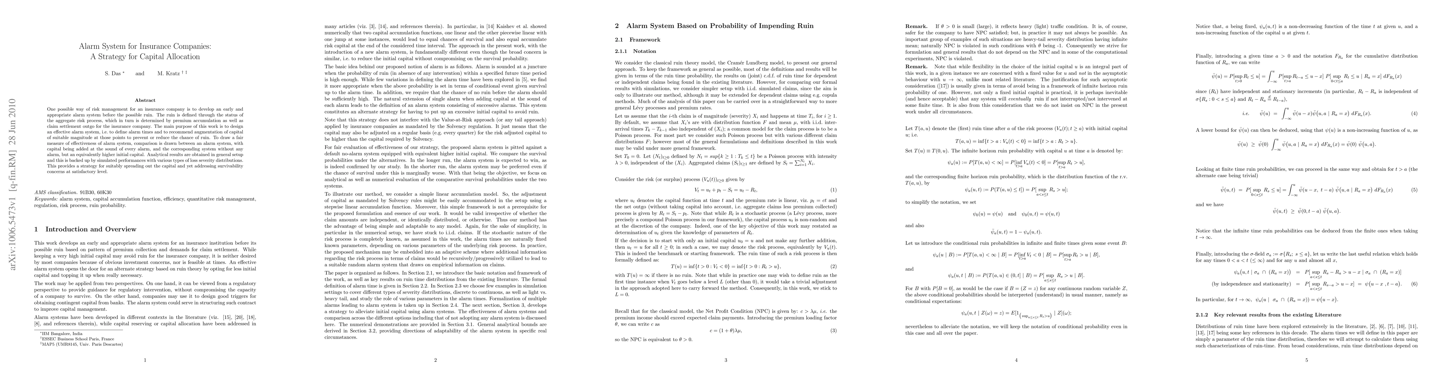 One possible way of risk management for an insurance company is to develop an early and appropriate alarm system before the possible ruin. The ruin is defined through the status of the aggregate risk process, which in turn is determined by premium accumulation as well as claim settlement outgo for the insurance company. The main purpose of this work is to design an effective alarm system, i.e. to define alarm times and to recommend augmentation of capital of suitable magnitude at those points to prevent or reduce the chance of ruin. To draw a fair measure of effectiveness of alarm system, comparison is drawn between an alarm system, with capital being added at the sound of every alarm, and the corresponding system without any alarm, but an equivalently higher initial capital. Analytical results are obtained in general setup and this is backed up by simulated performances with various types of loss severity distributions. This provides a strategy for suitably spreading out the capital and yet addressing survivability concerns at satisfactory level.