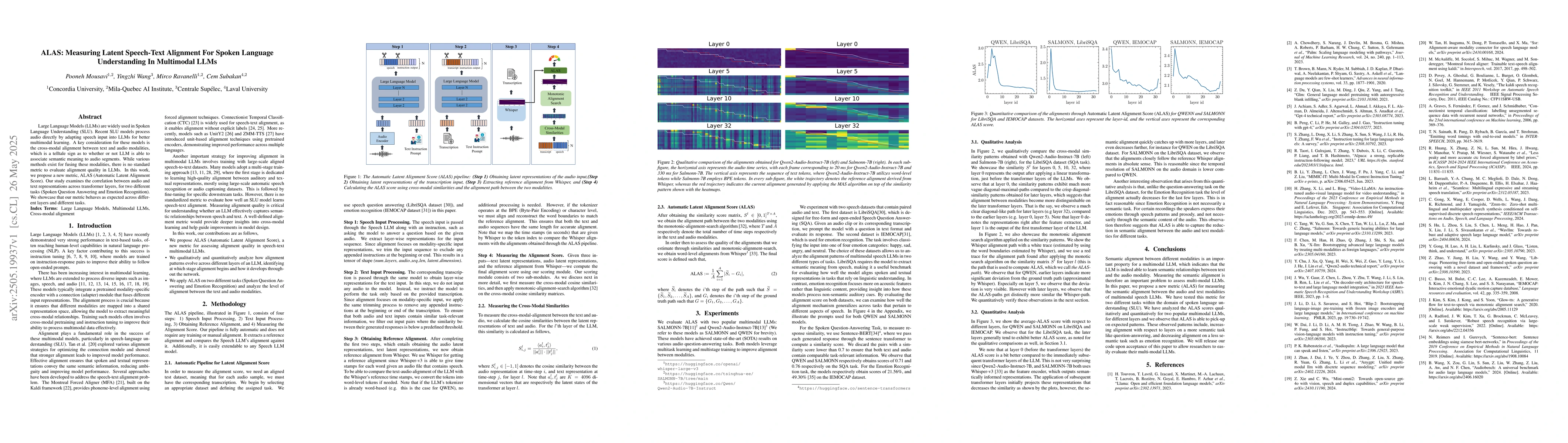 ALAS, a novel metric for assessing latent speech-text alignment in multimodal LLMs.