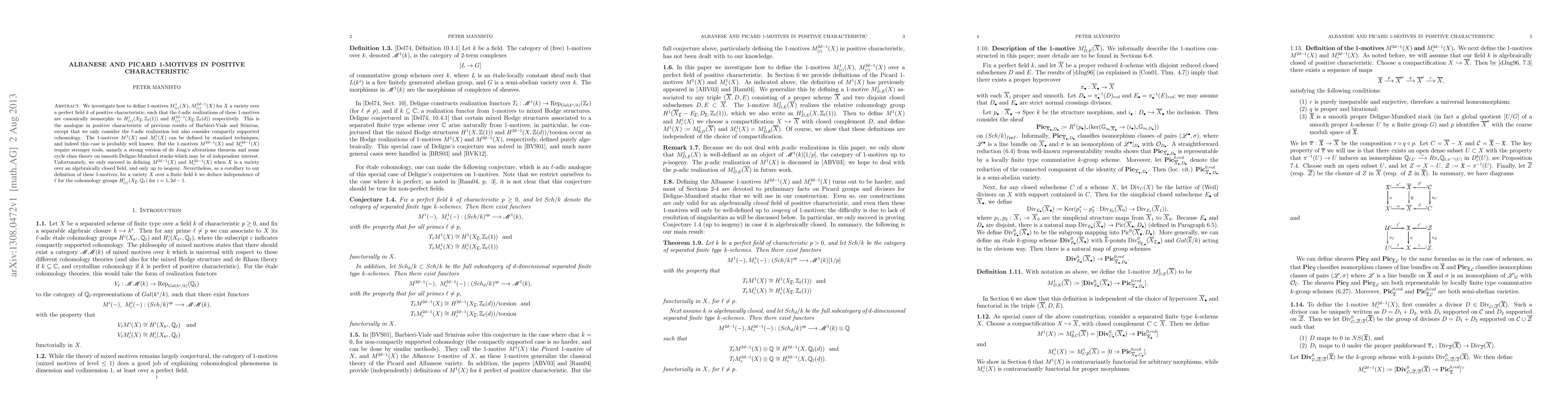 The research defines 1-motives of a variety X over a perfect field of positive characteristic, realizing etale cohomology groups in dimension and codimension one. It employs strong versions of de Jong's alteration theorem and cycle class theory on smooth Deligne-Mumford stacks.