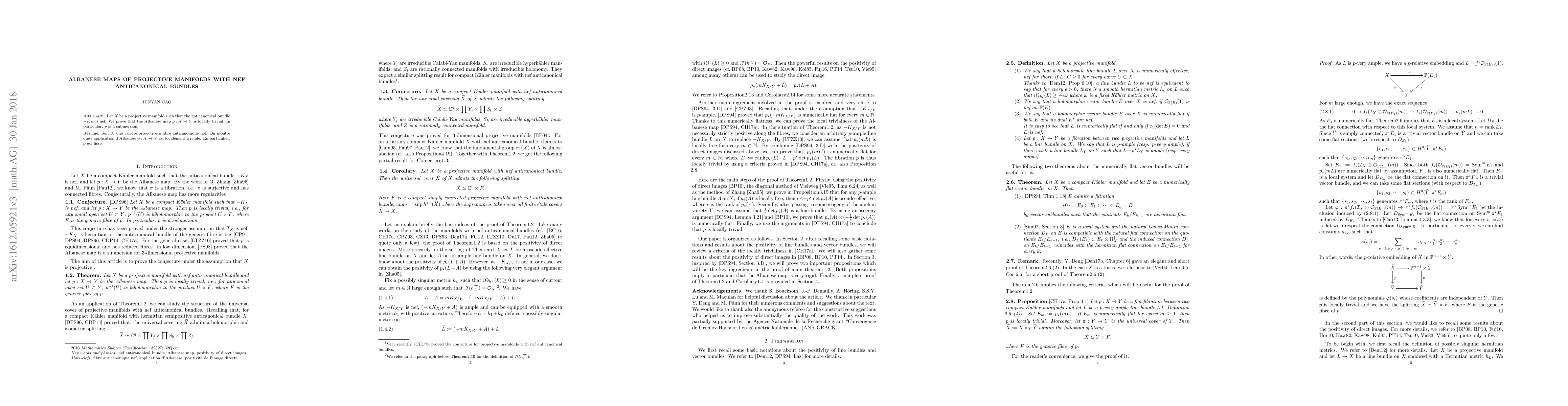 This paper proves that for projective manifolds $X$ with nef anticanonical bundles, the Albanese map $p: X \rightarrow Y$ is locally isotrivial, implying that $p$ is a submersion. This result highlights the relationship between nef anticanonical bundles and the structure of the Albanese map.