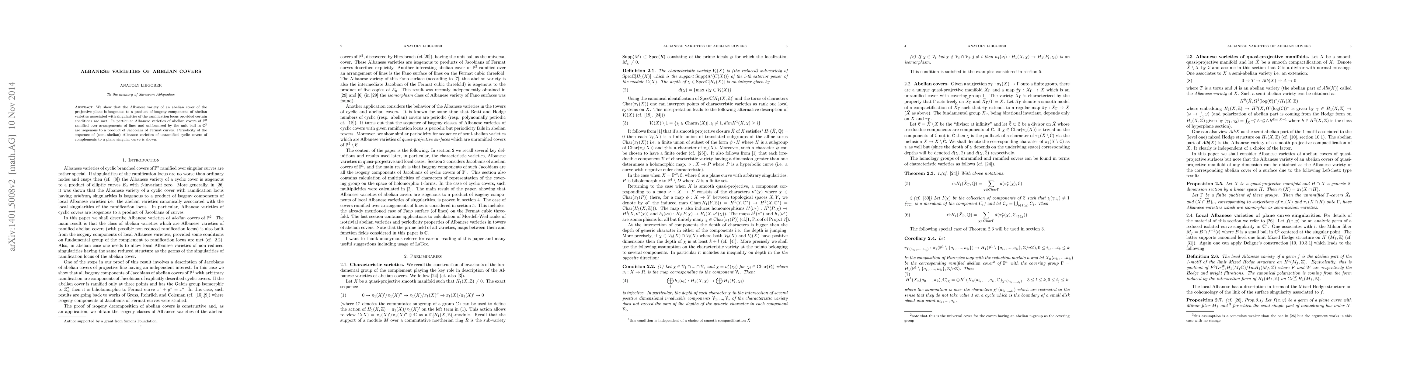We show that Albanese varieties of abelian covers of projective plane are isogenous to product of isogeny components of abelian varieties associated with singularities of the ramification locus. In particular Albanese varieties of abelian covers of projective plane ramified over arrangements of lines and uniformized by unit ball are isogenous to a product of Jacobians of Fermat curves. Periodicity of the sequence of (semi-abelian) Albanese varieties of unramified cyclic covers of complements to a plane singular curve is shown.