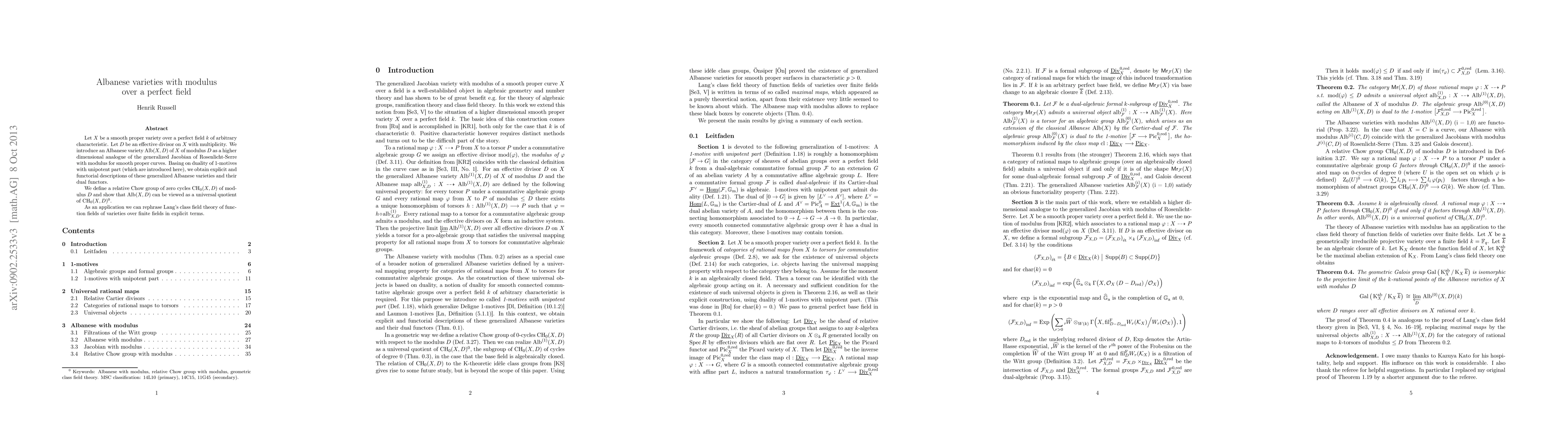 This paper introduces the Albanese variety of a smooth proper variety over a perfect field with a modulus divisor, providing explicit and functorial descriptions using 1-motives. It also defines a relative Chow group and shows the Albanese variety is a universal quotient of this group, with applications to Lang's class field theory.