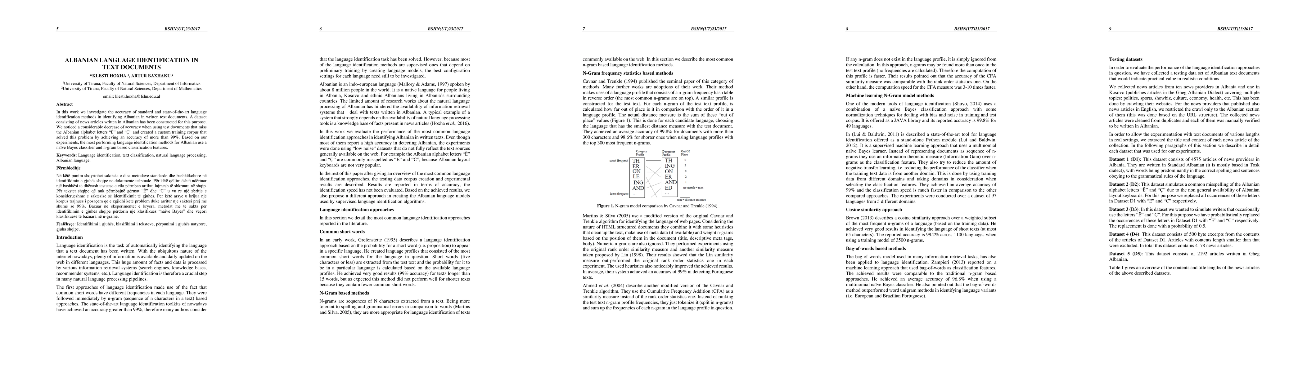In this work we investigate the accuracy of standard and state-of-the-art language identification methods in identifying Albanian in written text documents. A dataset consisting of news articles written in Albanian has been constructed for this purpose. We noticed a considerable decrease of accuracy when using test documents that miss the Albanian alphabet letters " \"E " and " \c{C} " and created a custom training corpus that solved this problem by achieving an accuracy of more than 99%. Based on our experiments, the most performing language identification methods for Albanian use a na\"ive Bayes classifier and n-gram based classification features.