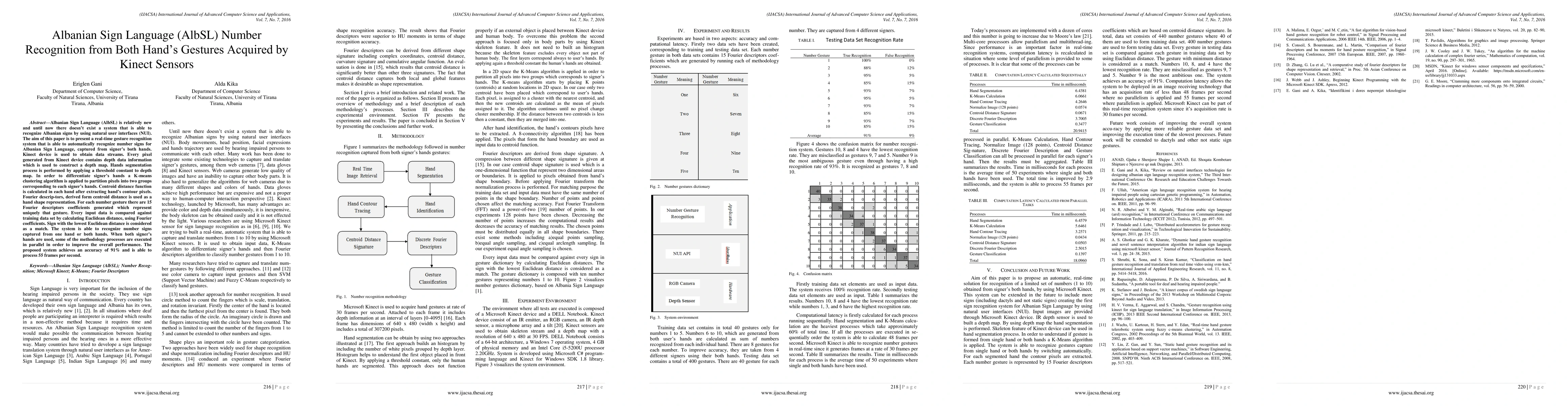 This paper presents a real-time gesture recognition system for Albanian Sign Language (AlbSL) number signs using Kinect sensors. It employs a combination of depth map construction, K-means clustering, and Fourier descriptors to differentiate and recognize hand gestures, achieving 91% accuracy at 55 frames per second.