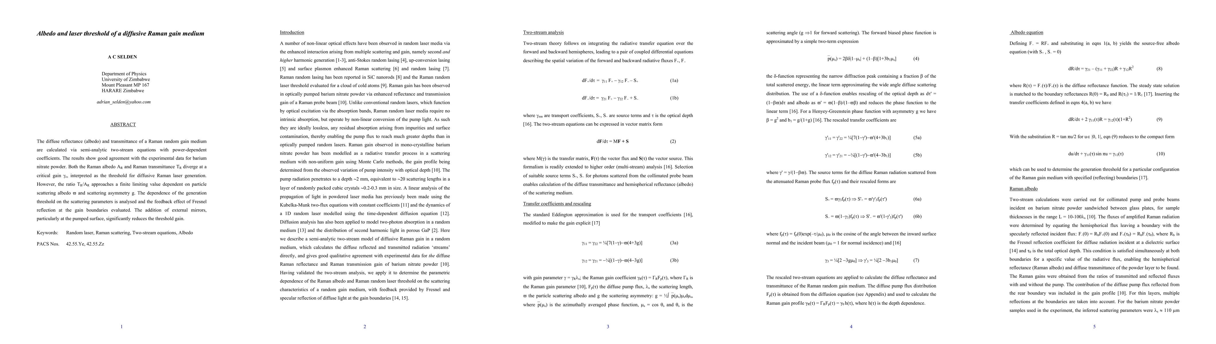 A study on a Raman random gain medium found that its albedo and transmittance diverge at a critical gain threshold for diffusive Raman laser generation, with external mirrors reducing the threshold gain.
