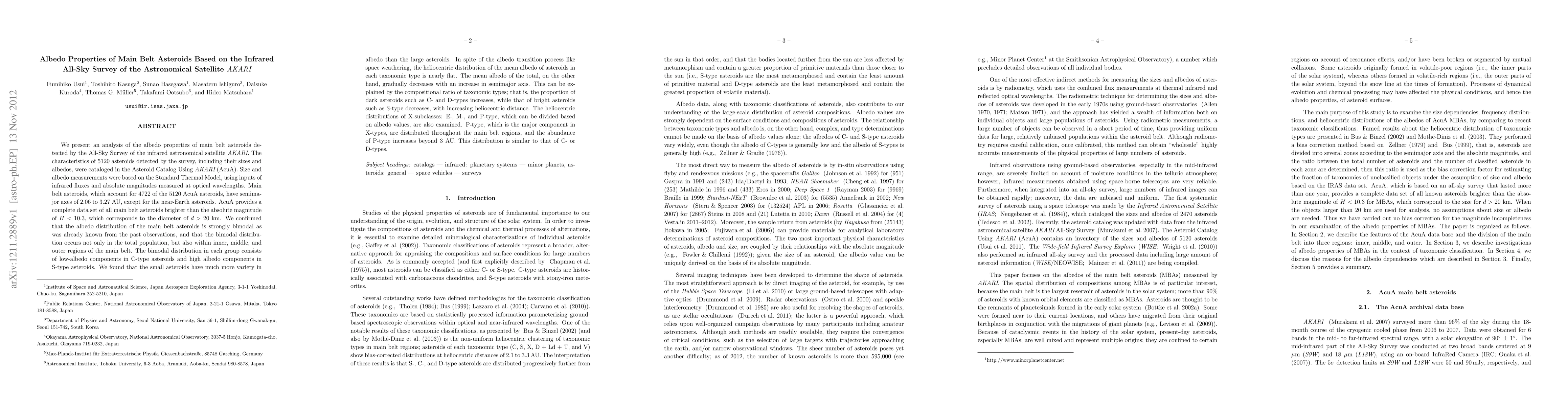 This paper analyzes the albedo properties of main belt asteroids detected by the AKARI satellite's infrared survey, revealing a strongly bimodal albedo distribution across different sizes and regions. The study confirms that small asteroids exhibit more albedo variability than large ones, while the mean albedo of the entire population decreases with increasing heliocentric distance due to compositional differences in asteroid types.