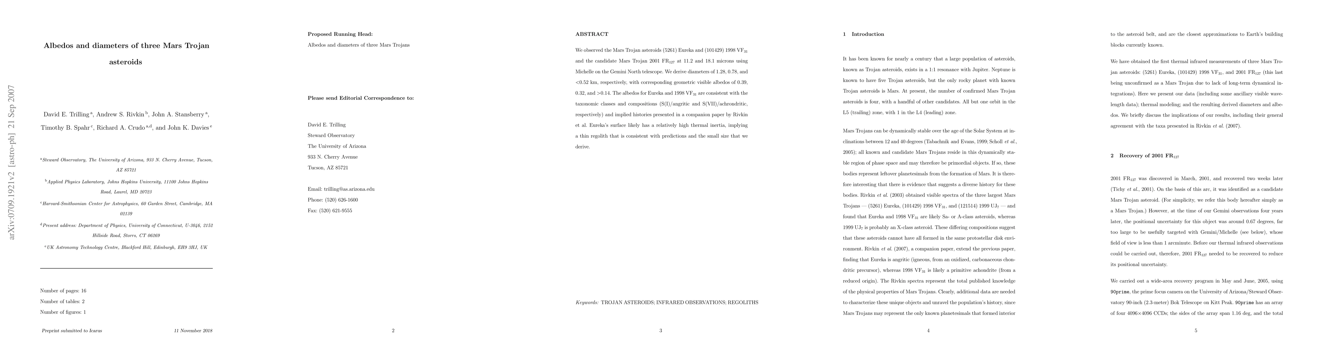 We observed the Mars Trojan asteroids (5261) Eureka and (101429) 1998 VF31 and the candidate Mars Trojan 2001 FR127 at 11.2 and 18.1 microns using Michelle on the Gemini North telescope. We derive diameters of 1.28, 0.78, and <0.52 km, respectively, with corresponding geometric visible albedos of 0.39, 0.32, and >0.14. The albedos for Eureka and 1998 VF31 are consistent with the taxonomic classes and compositions (S(I)/angritic and S(VII)/achrondritic, respectively) and implied histories presented in a companion paper by Rivkin et al. Eureka's surface likely has a relatively high thermal inertia, implying a thin regolith that is consistent with predictions and the small size that we derive.