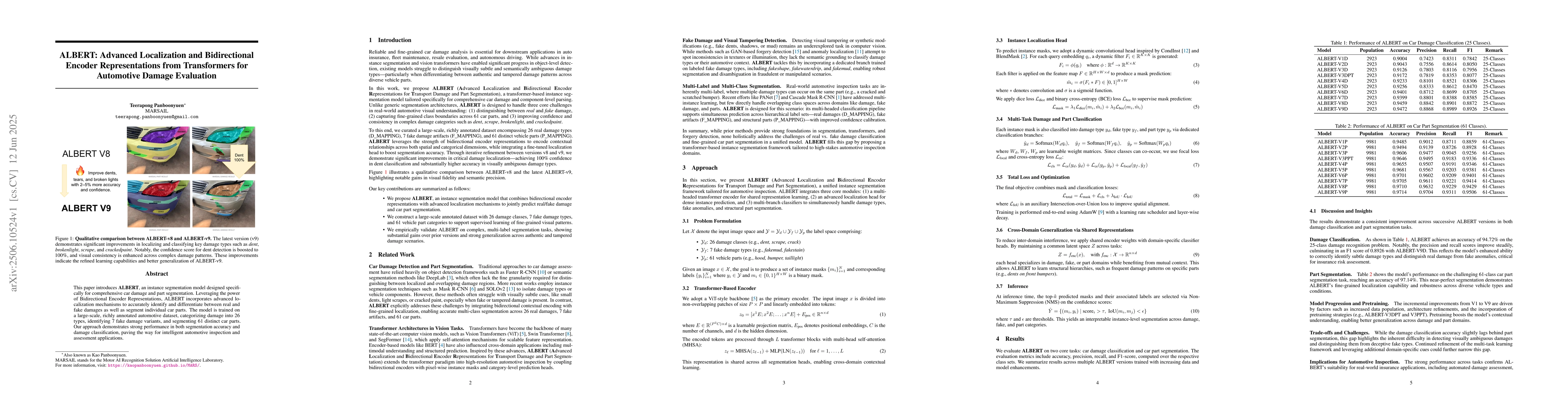 This paper introduces ALBERT, an instance segmentation model specifically designed for comprehensive car damage and part segmentation. Leveraging the power of Bidirectional Encoder Representations, ALBERT incorporates advanced localization mechanisms to accurately identify and differentiate between real and fake damages, as well as segment individual car parts. The model is trained on a large-scale, richly annotated automotive dataset that categorizes damage into 26 types, identifies 7 fake damage variants, and segments 61 distinct car parts. Our approach demonstrates strong performance in both segmentation accuracy and damage classification, paving the way for intelligent automotive inspection and assessment applications.