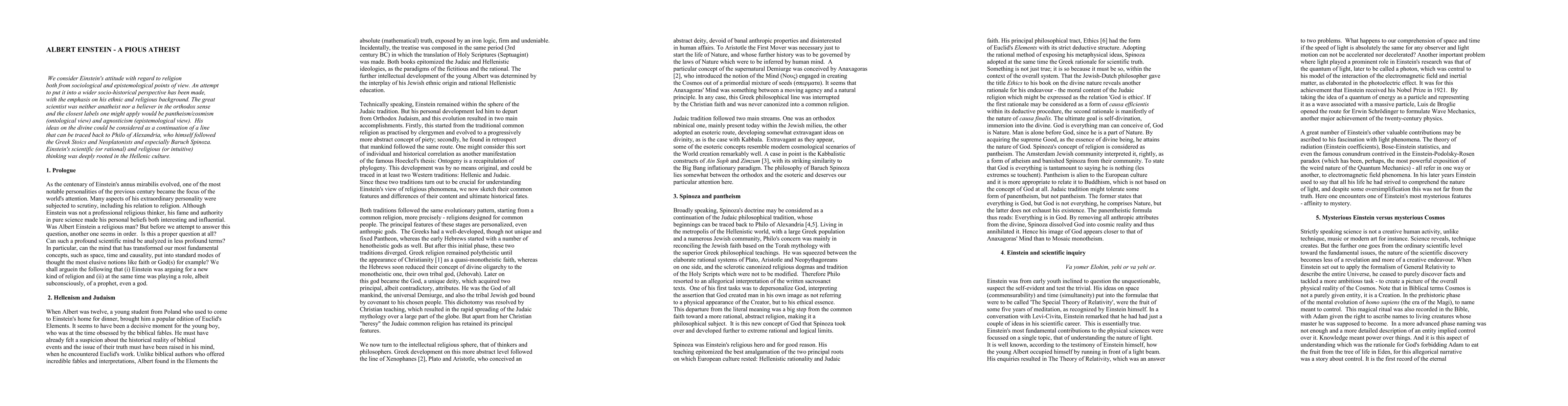 We consider Einstein's attitude with regard to religion both from sociological and epistemological points of view. An attempt to put it into a wider socio-historical perspective has been made, with the emphasis on his ethnic and religious background. The great scientist was neither anatheist nor a believer in the orthodox sense and the closest labels one might apply would be pantheism/cosmism (ontological view) and agnosticism (epistemological view). His ideas on the divine could be considered as a continuation of a line that can be traced back to Philo of Alexandria, who himself followed the Greek Stoics and Neoplatonists and especially Baruch Spinoza. Einstein's scientific (or rational) and religious (or intuitive) thinking was deeply rooted in the Hellenic culture.