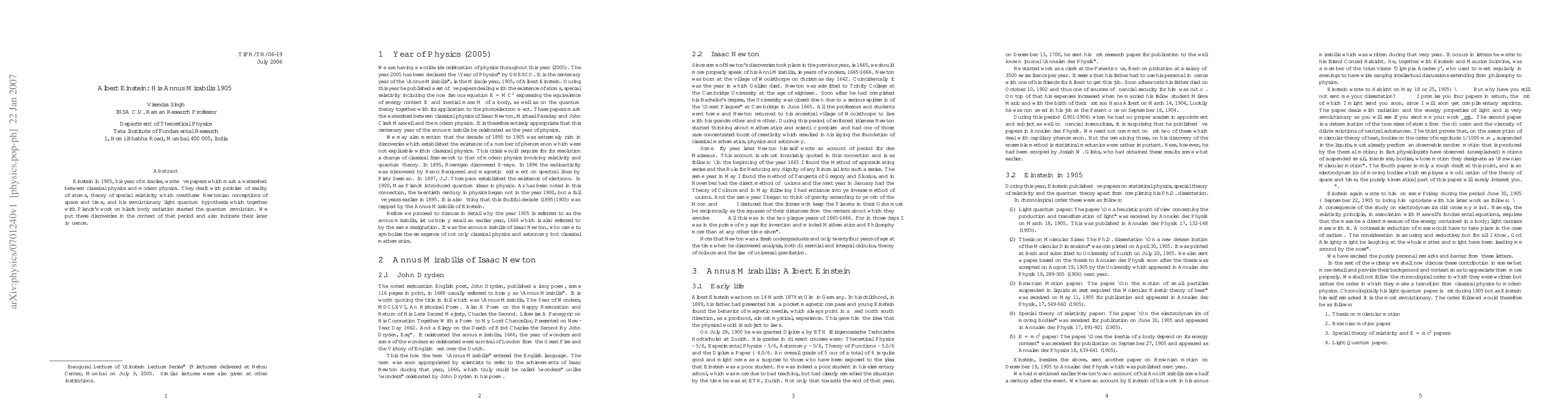 Einstein in 1905, his year of miracles, wrote five papers which mark a watershed between classical physics and modern physics. They dealt with problem of reality of atoms, theory of special relativity which overthrew Newtonian conceptions of space and time, and his revolutionary light quantum hypothesis which together with Planck's work on black body radiation started the quantum revolution. We put these discoveries in the context of that period and also indicate their later influence.