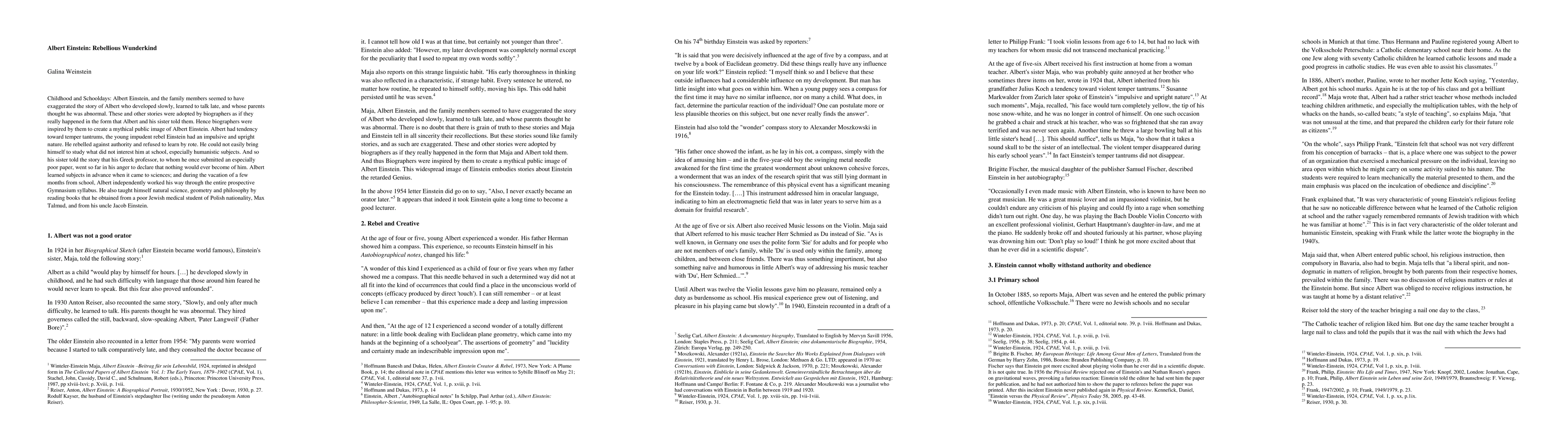 This paper explores the childhood and early school years of Albert Einstein, highlighting how exaggerated stories of his slow development and rebellious nature were adopted by biographers to create a mythical public image. Despite his early struggles, Einstein's independent learning in science, geometry, and philosophy set the stage for his future achievements.