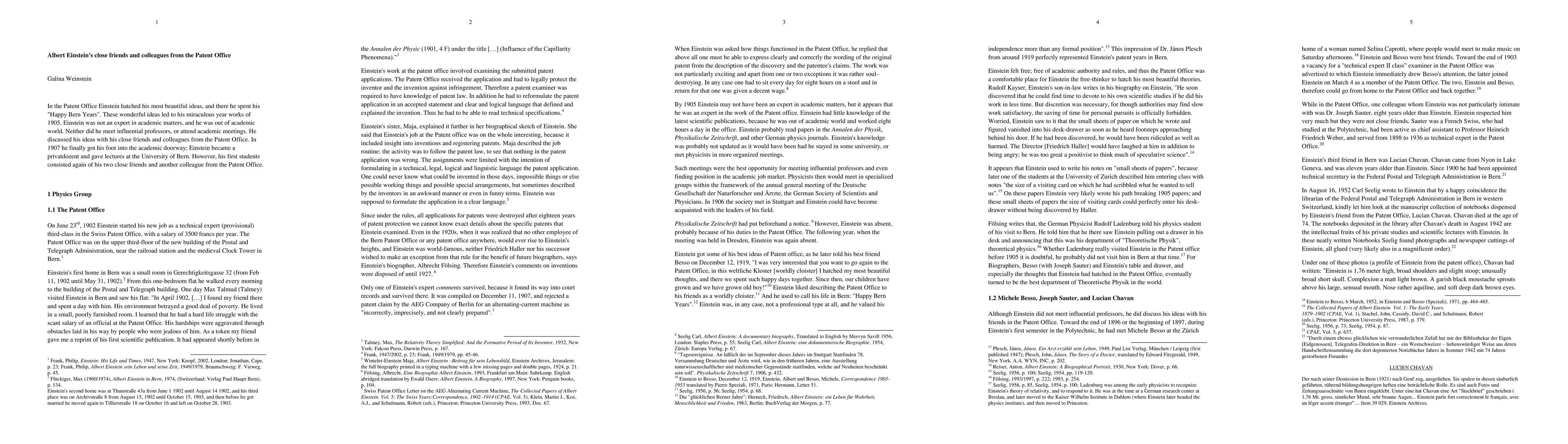 In the Patent Office Einstein hatched his most beautiful ideas, and there he spent his "Happy Bern Years". These wonderful ideas led to his miraculous year works of 1905. Einstein was not an expert in academic matters, and he was out of academic world. Neither did he meet influential professors, or attend academic meetings. He discussed his ideas with his close friends and colleagues from the Patent Office. In 1907 he finally got his foot into the academic doorway; Einstein became a privatdozent and gave lectures at the University of Bern. However, his first students consisted again of his two close friends and another colleague from the Patent Office.