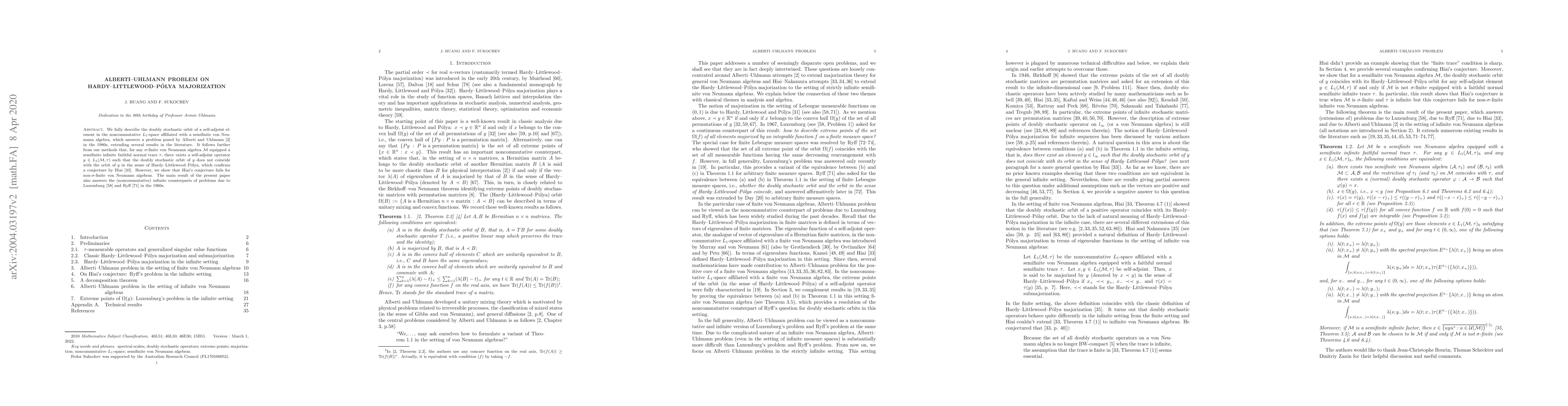 We fully describe the doubly stochastic orbit of a self-adjoint element in the noncommutative $L_1$-space affiliated with a semifinite von Neumann algebra, which answers a problem posed by Alberti and Uhlmann in the 1980s, extending several results in the literature. It follows further from our methods that, for any $\sigma$-finite von Neumann algebra $\mathcal{M}$ equipped a semifinite infinite faithful normal trace $\tau$, there exists a self-adjoint operator $y\in L_1(\mathcal{M},\tau)$ such that the doubly stochastic orbit of $y$ does not coincide with the orbit of $y$ in the sense of Hardy--Littlewood--P\'{o}lya, which confirms a conjecture by Hiai. However, we show that Hiai's conjecture fails for non-$\sigma$-finite von Neumann algebras. The main result of the present paper also answers the (noncommutative) infinite counterparts of problems due to Luxemburg and Ryff in the 1960s.