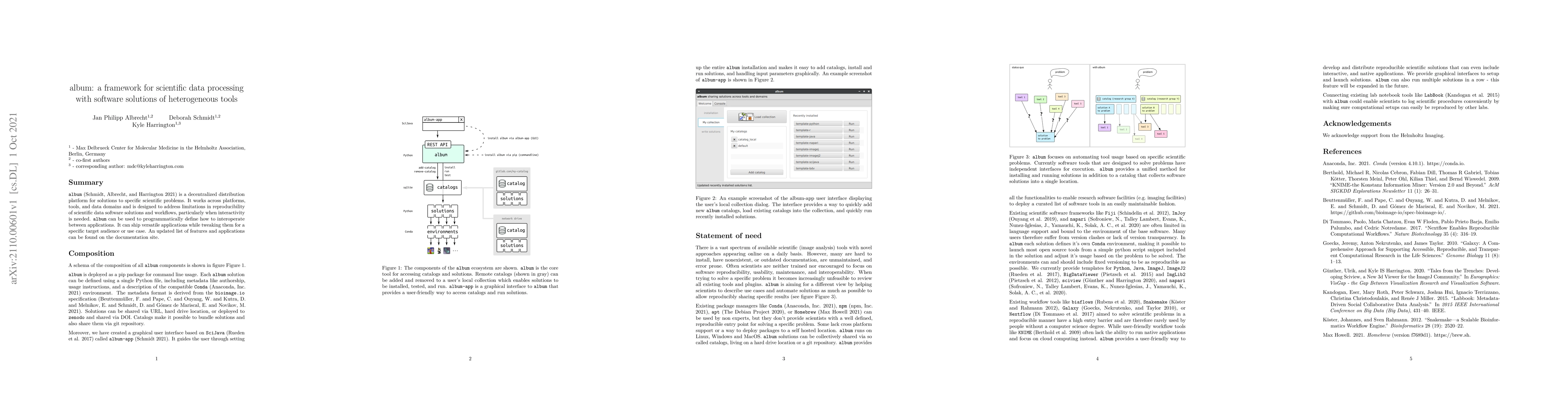 Album is a decentralized platform for scientific data processing that integrates heterogeneous tools, aiming to enhance reproducibility and interactivity in scientific workflows. It facilitates the interoperability of various applications across platforms and data domains, tailored to specific scientific problems and use cases.