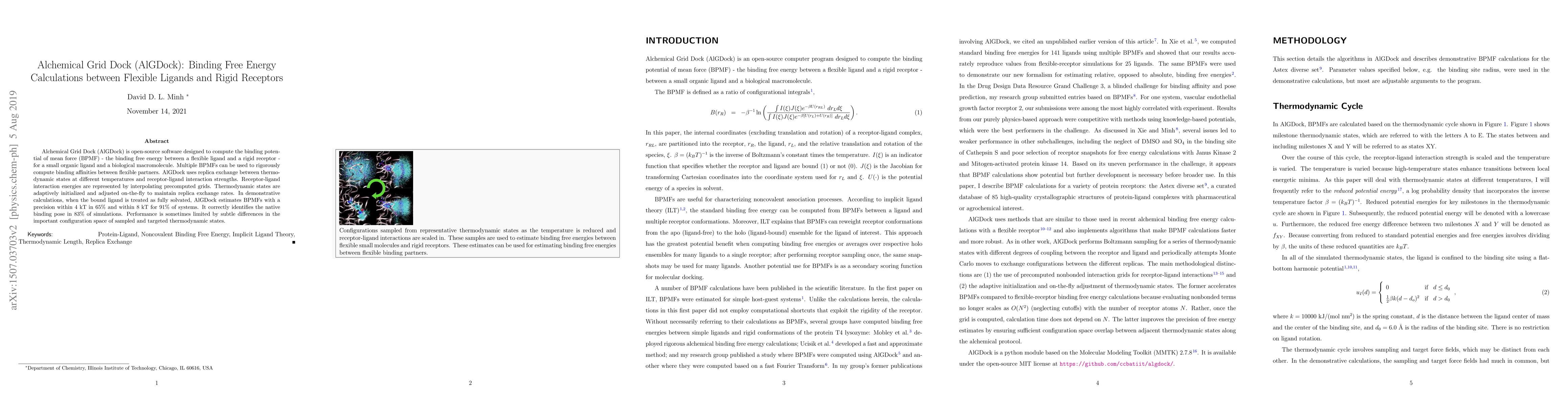 Alchemical Grid Dock (AlGDock) is an open-source software for calculating binding free energy between flexible ligands and rigid receptors, achieving precision within 4 kT in 65% of cases and correctly identifying the native binding pose in 83% of simulations. It employs replica exchange and adaptive thermodynamic state initialization.