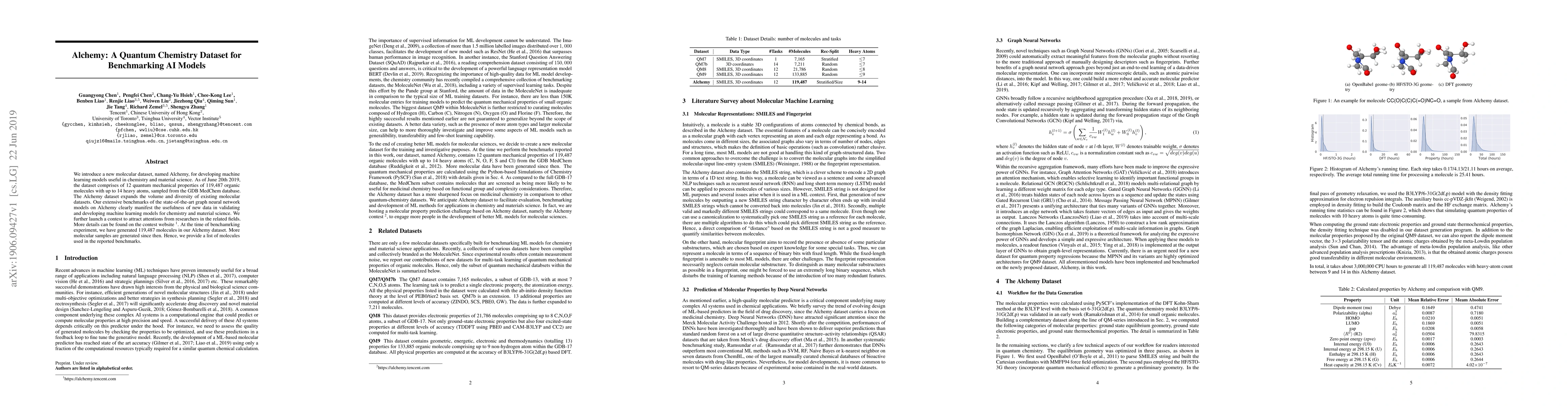We introduce a new molecular dataset, named Alchemy, for developing machine learning models useful in chemistry and material science. As of June 20th 2019, the dataset comprises of 12 quantum mechanical properties of 119,487 organic molecules with up to 14 heavy atoms, sampled from the GDB MedChem database. The Alchemy dataset expands the volume and diversity of existing molecular datasets. Our extensive benchmarks of the state-of-the-art graph neural network models on Alchemy clearly manifest the usefulness of new data in validating and developing machine learning models for chemistry and material science. We further launch a contest to attract attentions from researchers in the related fields. More details can be found on the contest website \footnote{https://alchemy.tencent.com}. At the time of benchamrking experiment, we have generated 119,487 molecules in our Alchemy dataset. More molecular samples are generated since then. Hence, we provide a list of molecules used in the reported benchmarks.