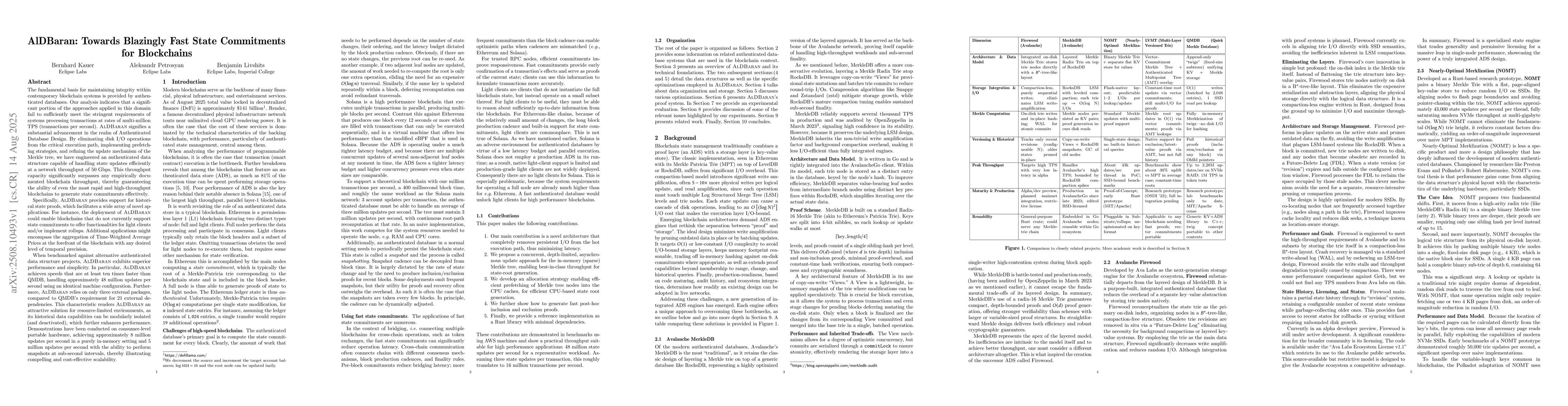 The fundamental basis for maintaining integrity within contemporary blockchain systems is provided by authenticated databases. Our analysis indicates that a significant portion of the approaches applied in this domain fail to sufficiently meet the stringent requirements of systems processing transactions at rates of multi-million TPS. AlDBaran signifies a substantial advancement in authenticated databases. By eliminating disk I/O operations from the critical path, implementing prefetching strategies, and refining the update mechanism of the Merkle tree, we have engineered an authenticated data structure capable of handling state updates efficiently at a network throughput of 50 Gbps. This throughput capacity significantly surpasses any empirically documented blockchain throughput, guaranteeing the ability of even the most high-throughput blockchains to generate state commitments effectively. AlDBaran provides support for historical state proofs, which facilitates a wide array of novel applications. For instance, the deployment of AlDBaran could enable blockchains that do not currently support state commitments to offer functionalities for light clients and/or implement rollups. When benchmarked against alternative authenticated data structure projects, AlDBaran exhibits superior performance and simplicity. In particular, AlDBaran achieves speeds of approximately 48 million updates per second using an identical machine configuration. This characteristic renders AlDBaran an attractive solution for resource-limited environments, as its historical data capabilities can be modularly isolated (and deactivated), which further enhances performance. On consumer-level portable hardware, it achieves approximately 8 million updates/s in an in-memory setting and 5 million updates/s with snapshots at sub-second intervals, illustrating compelling and cost-effective scalability.