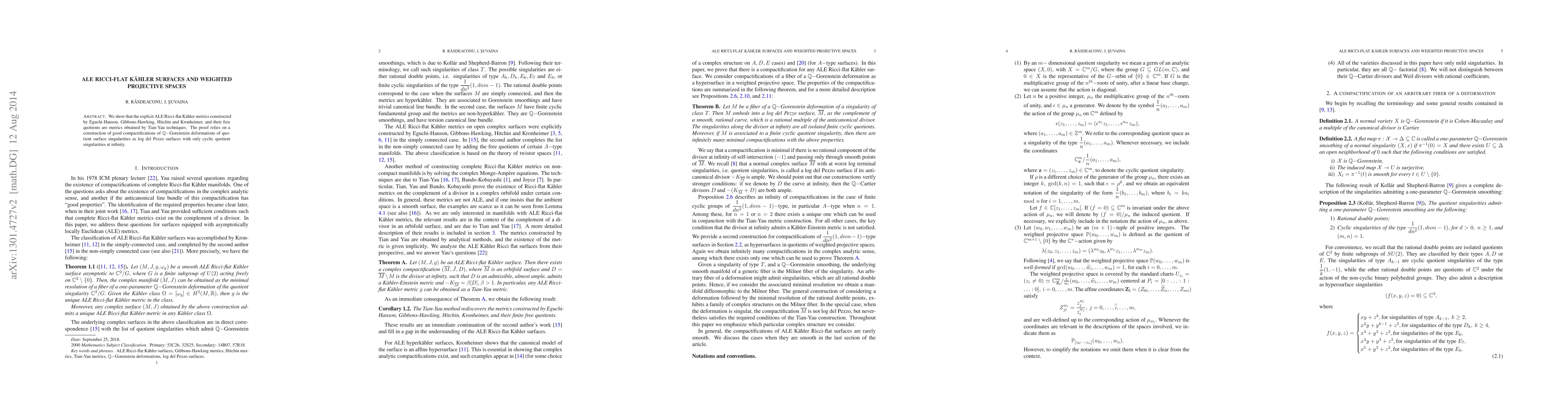 This paper demonstrates that ALE Ricci-flat Kähler metrics, including those by Eguchi-Hanson, Gibbons-Hawking, Hitchin, and Kronheimer, are derived using Tian-Yau techniques. The proof hinges on constructing good compactifications of Q-Gorenstein deformations of quotient surface singularities as log del Pezzo surfaces with cyclic quotient singularities at infinity.