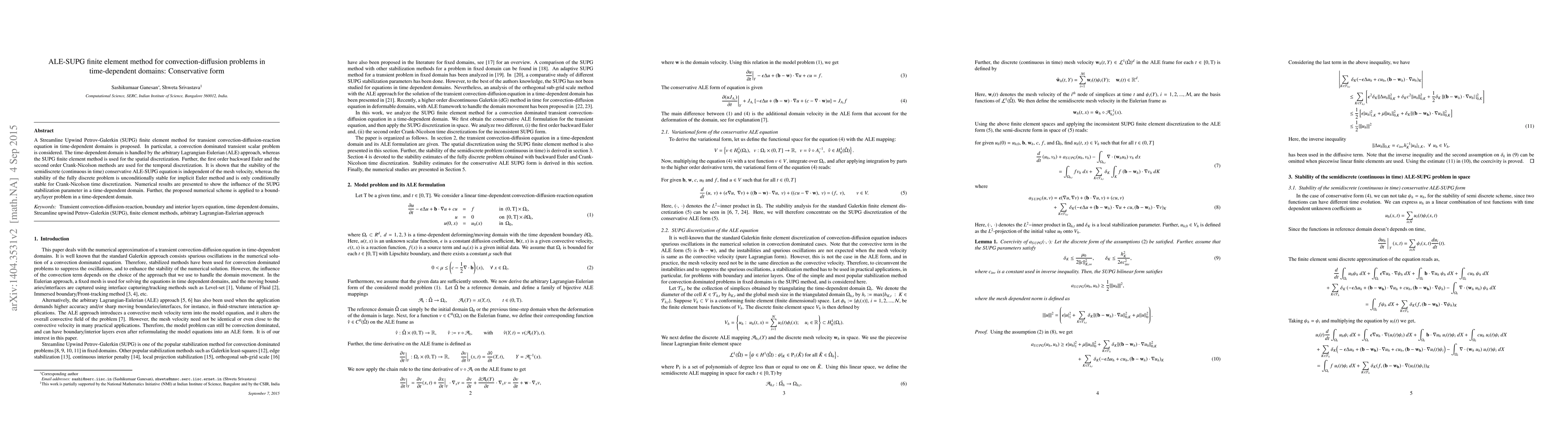 This paper proposes a Streamline Upwind Petrov-Galerkin (SUPG) finite element method for solving convection-diffusion problems in time-dependent domains using the ALE approach. The method is shown to be unconditionally stable for implicit Euler and conditionally stable for Crank-Nicolson temporal discretization. Numerical results demonstrate the effectiveness of the SUPG stabilization parameter.