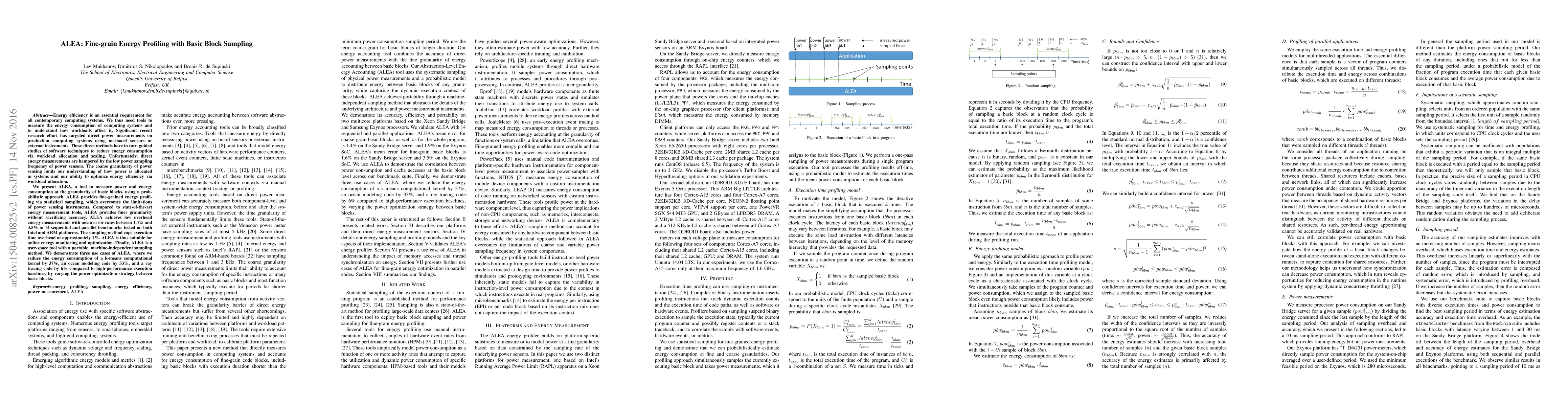 Energy efficiency is an essential requirement for all contemporary computing systems. We thus need tools to measure the energy consumption of computing systems and to understand how workloads affect it. Significant recent research effort has targeted direct power measurements on production computing systems using on-board sensors or external instruments. These direct methods have in turn guided studies of software techniques to reduce energy consumption via workload allocation and scaling. Unfortunately, direct energy measurements are hampered by the low power sampling frequency of power sensors. The coarse granularity of power sensing limits our understanding of how power is allocated in systems and our ability to optimize energy efficiency via workload allocation. We present ALEA, a tool to measure power and energy consumption at the granularity of basic blocks, using a probabilistic approach. ALEA provides fine-grained energy profiling via statistical sampling, which overcomes the limitations of power sensing instruments. Compared to state-of-the-art energy measurement tools, ALEA provides finer granularity without sacrificing accuracy. ALEA achieves low overhead energy measurements with mean error rates between 1.4% and 3.5% in 14 sequential and parallel benchmarks tested on both Intel and ARM platforms. The sampling method caps execution time overhead at approximately 1%. ALEA is thus suitable for online energy monitoring and optimization. Finally, ALEA is a user-space tool with a portable, machine-independent sampling method. We demonstrate two use cases of ALEA, where we reduce the energy consumption of a k-means computational kernel by 37% and an ocean modelling code by 33%, compared to high-performance execution baselines, by varying the power optimization strategy between basic blocks.