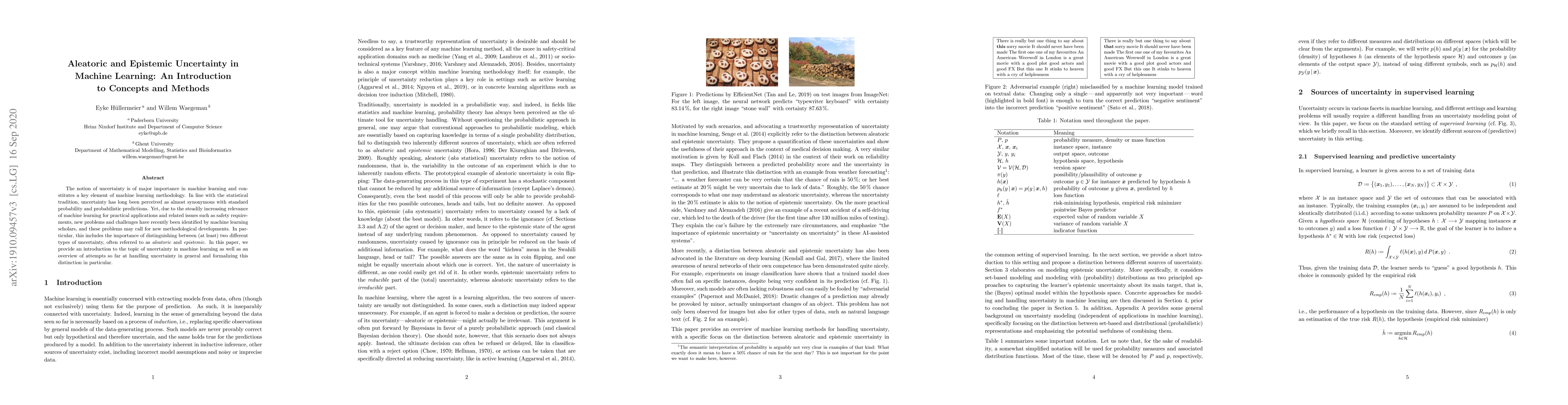 The notion of uncertainty is of major importance in machine learning and constitutes a key element of machine learning methodology. In line with the statistical tradition, uncertainty has long been perceived as almost synonymous with standard probability and probabilistic predictions. Yet, due to the steadily increasing relevance of machine learning for practical applications and related issues such as safety requirements, new problems and challenges have recently been identified by machine learning scholars, and these problems may call for new methodological developments. In particular, this includes the importance of distinguishing between (at least) two different types of uncertainty, often referred to as aleatoric and epistemic. In this paper, we provide an introduction to the topic of uncertainty in machine learning as well as an overview of attempts so far at handling uncertainty in general and formalizing this distinction in particular.