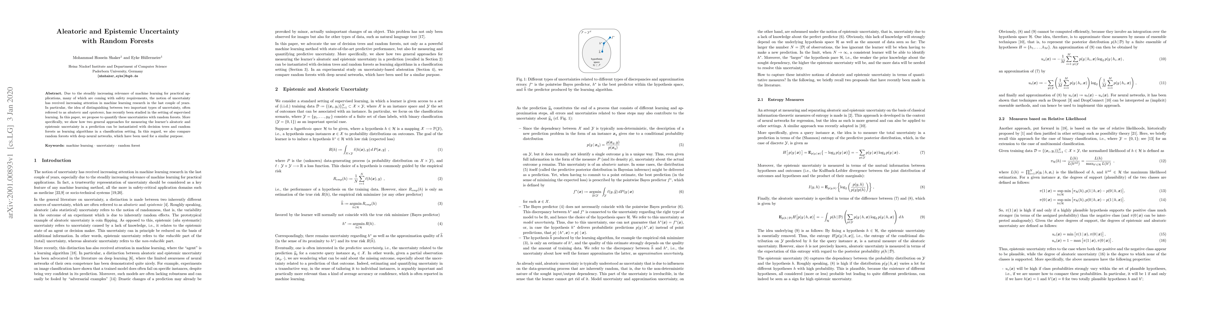 Due to the steadily increasing relevance of machine learning for practical applications, many of which are coming with safety requirements, the notion of uncertainty has received increasing attention in machine learning research in the last couple of years. In particular, the idea of distinguishing between two important types of uncertainty, often refereed to as aleatoric and epistemic, has recently been studied in the setting of supervised learning. In this paper, we propose to quantify these uncertainties with random forests. More specifically, we show how two general approaches for measuring the learner's aleatoric and epistemic uncertainty in a prediction can be instantiated with decision trees and random forests as learning algorithms in a classification setting. In this regard, we also compare random forests with deep neural networks, which have been used for a similar purpose.