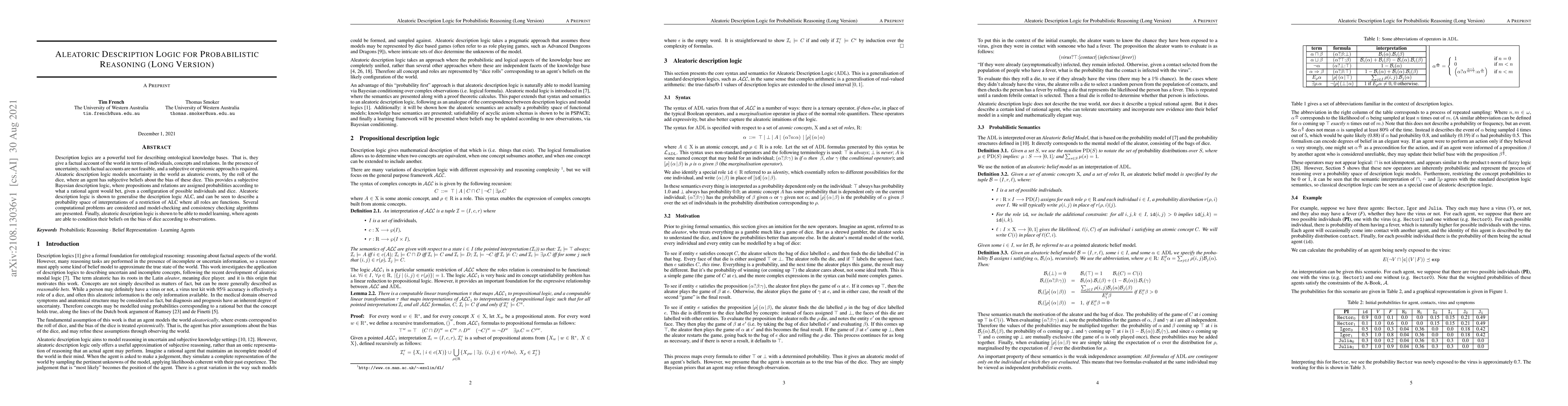 This research paper introduces Aleatoric Description Logic, a new framework for modeling uncertainty in ontological knowledge bases using subjective Bayesian reasoning. It shows the logic can generalize existing description logics, model learning, and handle probabilistic interpretations of restrictions on roles.