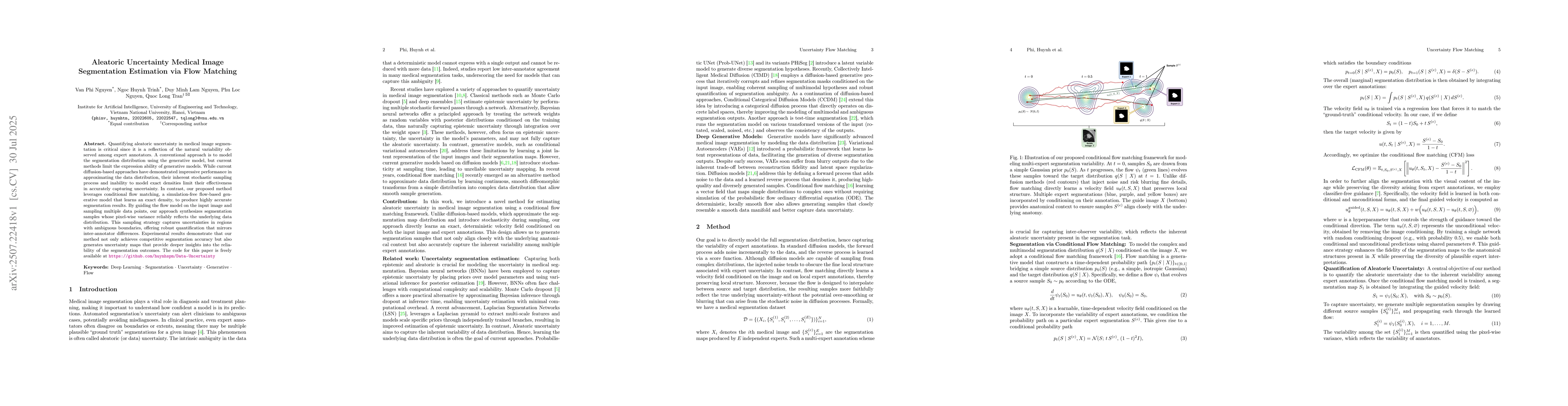 Introduces a novel conditional flow matching framework for estimating aleatoric uncertainty in medical image segmentation, directly learning a velocity field while preserving fine anatomical details and capturing variability in multi-expert annotations.