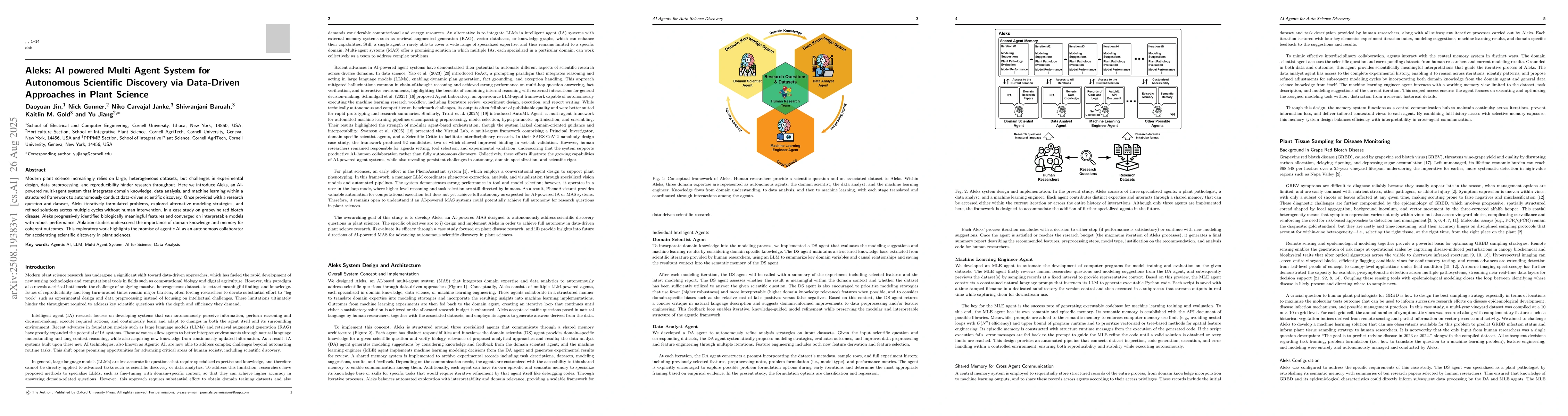 Modern plant science increasingly relies on large, heterogeneous datasets, but challenges in experimental design, data preprocessing, and reproducibility hinder research throughput. Here we introduce Aleks, an AI-powered multi-agent system that integrates domain knowledge, data analysis, and machine learning within a structured framework to autonomously conduct data-driven scientific discovery. Once provided with a research question and dataset, Aleks iteratively formulated problems, explored alternative modeling strategies, and refined solutions across multiple cycles without human intervention. In a case study on grapevine red blotch disease, Aleks progressively identified biologically meaningful features and converged on interpretable models with robust performance. Ablation studies underscored the importance of domain knowledge and memory for coherent outcomes. This exploratory work highlights the promise of agentic AI as an autonomous collaborator for accelerating scientific discovery in plant sciences.