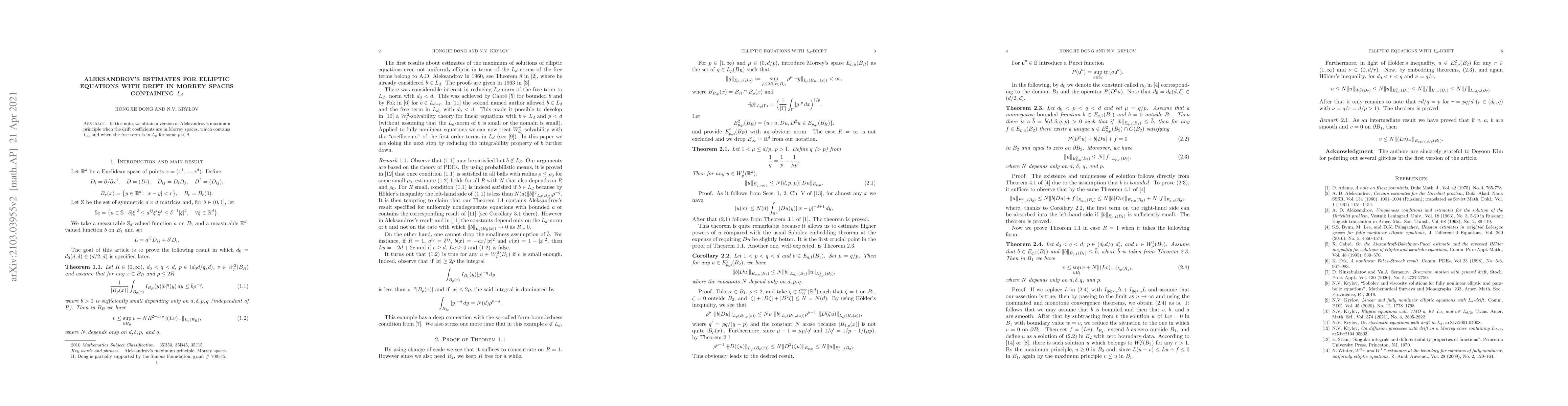 drift coefficients are in Morrey spaces, which contains $L_d$, and when the