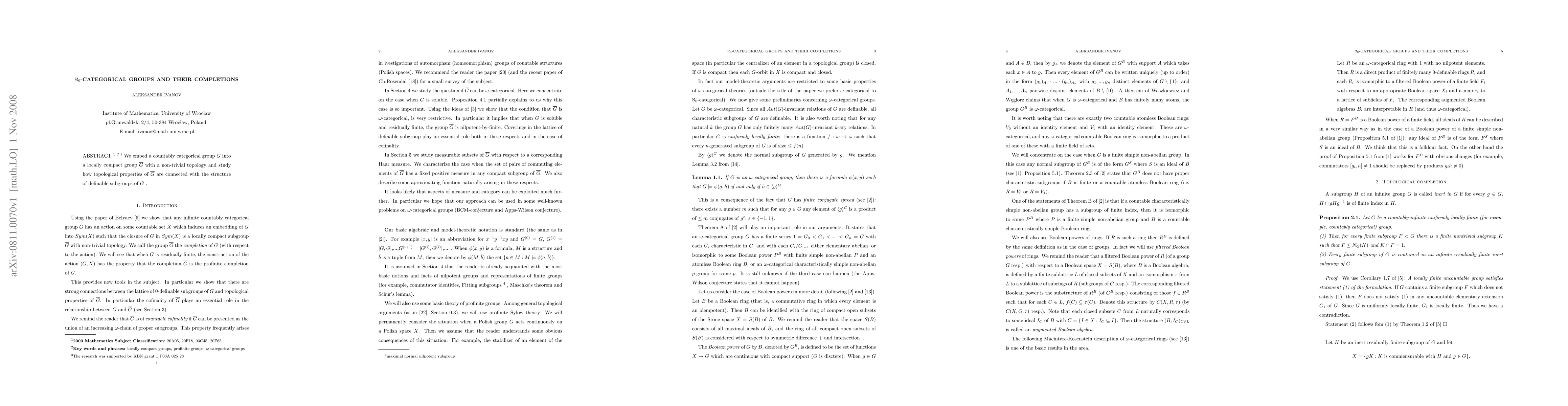 We embed a countably categorical group G into a locally compact group c(G) with a non-trivial topology and study how topological properties of c(G) are connected with the structure of definable subgroups of G.