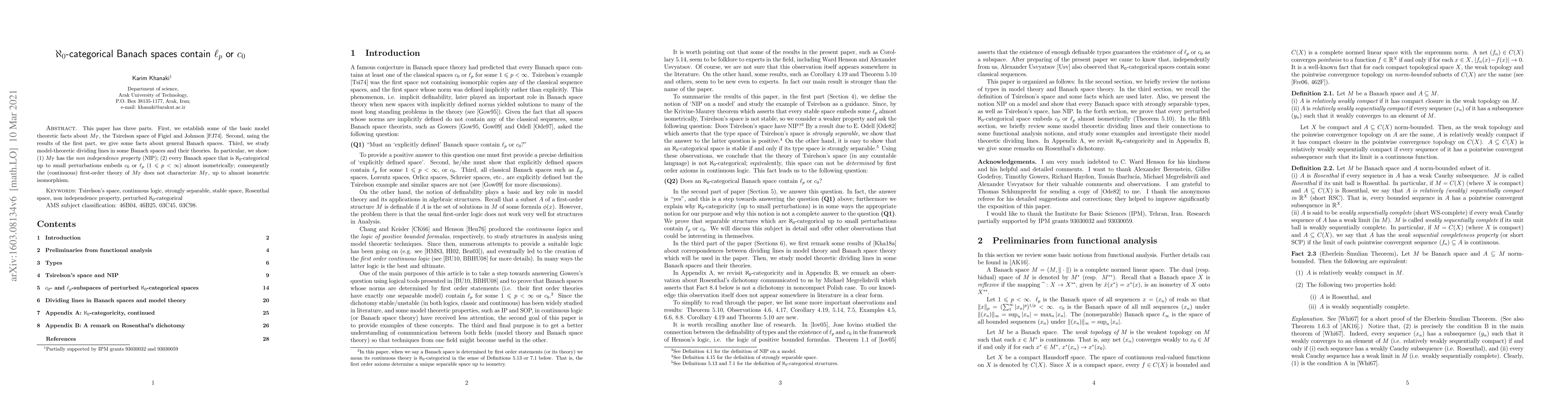 This paper explores model-theoretic properties of $\aleph_0$-categorical Banach spaces, showing that such spaces almost isometrically embed $\ell_p$ or $c_0$ for $1 \leq p < \infty$. It also demonstrates that the Tsirelson space $M_{\mathcal{T}}$ has the non-independence property and does not have a first-order theory characterizing it up to almost isometric isomorphism.
