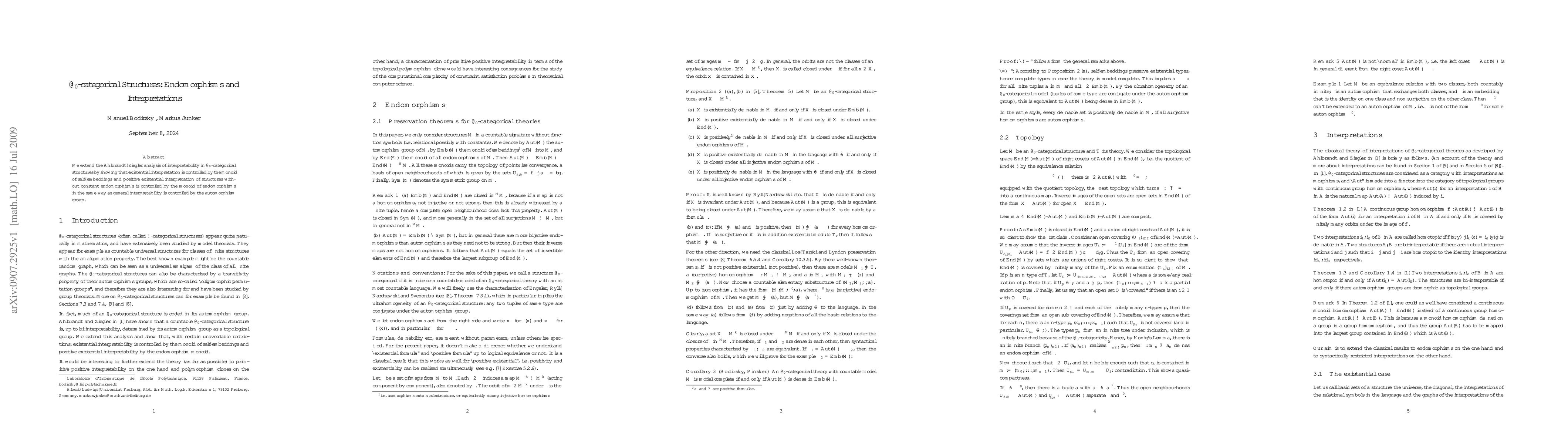We extend the Ahlbrandt--Ziegler analysis of interpretability in aleph_0-categorical structures by showing that existential interpretation is controlled by the monoid of self--embeddings and positive existential interpretation of structures without constant endomorphisms is controlled by the monoid of endomorphisms in the same way as general interpretability is controlled by the automorphism group.
