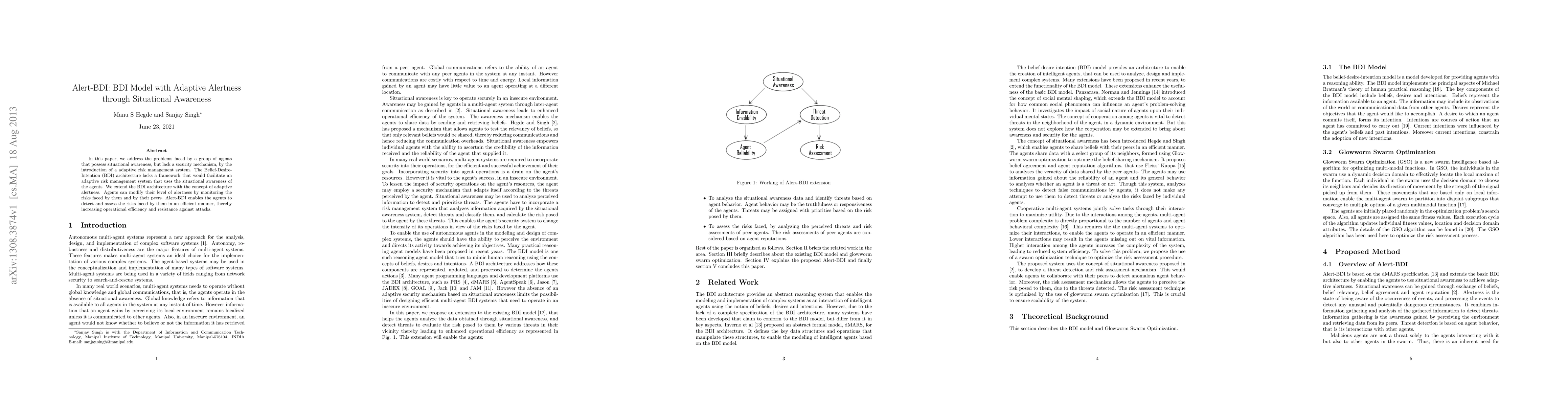 In this paper, we address the problems faced by a group of agents that possess situational awareness, but lack a security mechanism, by the introduction of a adaptive risk management system. The Belief-Desire-Intention (BDI) architecture lacks a framework that would facilitate an adaptive risk management system that uses the situational awareness of the agents. We extend the BDI architecture with the concept of adaptive alertness. Agents can modify their level of alertness by monitoring the risks faced by them and by their peers. Alert-BDI enables the agents to detect and assess the risks faced by them in an efficient manner, thereby increasing operational efficiency and resistance against attacks.