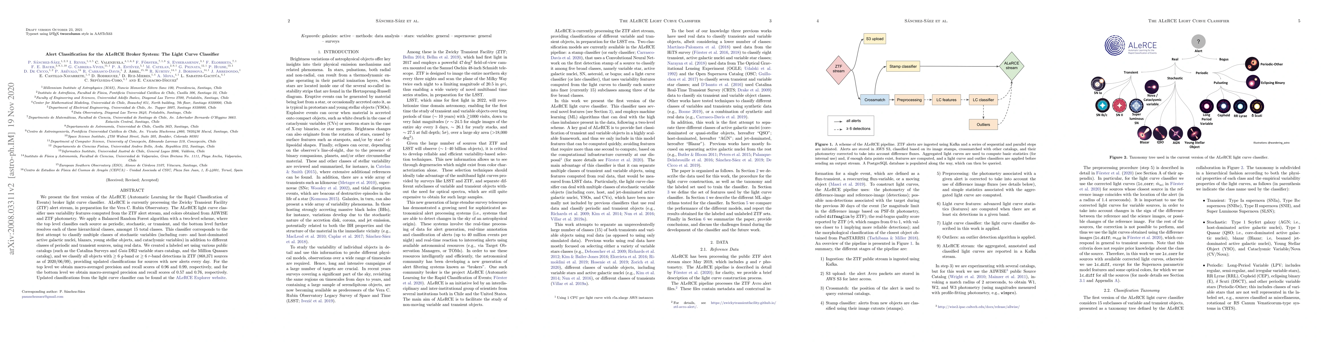 The ALeRCE broker light curve classifier uses variability features and colors to classify astronomical events from the Zwicky Transient Facility alert stream into periodic, stochastic, or transient categories, with a Balanced Random Forest algorithm achieving high precision and recall for top-level classifications. The system updates classifications daily for over 868,000 sources.