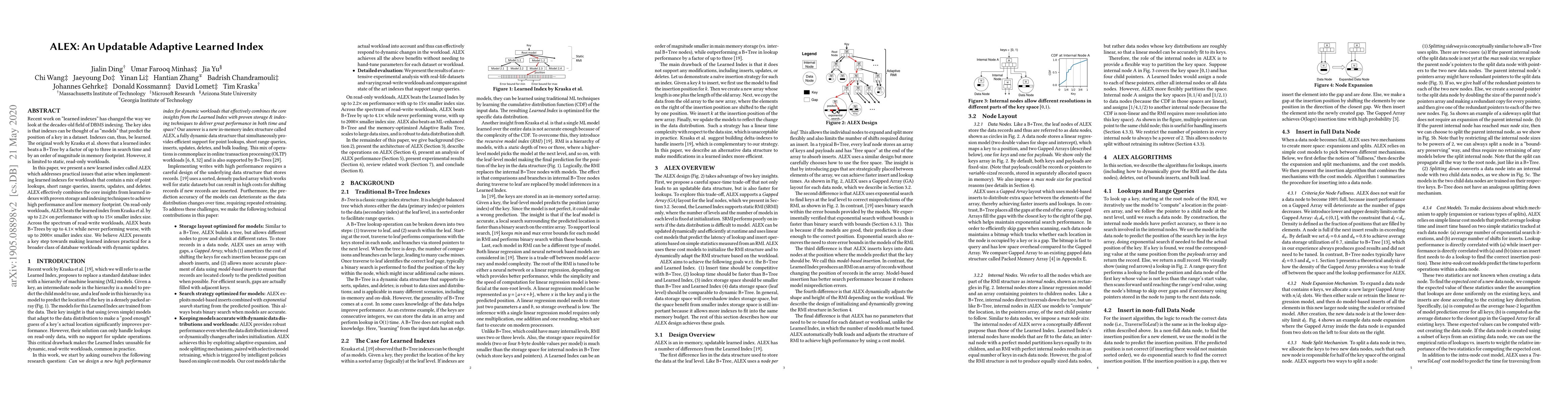 This paper introduces ALEX, an updatable adaptive learned index that outperforms traditional B+Trees and previous learned indexes in both read-only and dynamic read-write workloads, achieving up to 15X smaller index size and significant performance gains. ALEX effectively integrates learned indexing with storage techniques for practical database use.