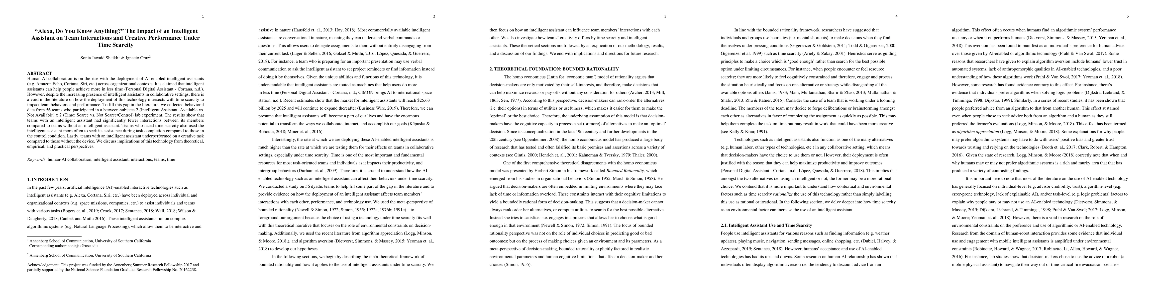 This study investigates how the use of intelligent assistants affects team interactions and creative performance under time pressure. Results from a lab experiment reveal that teams with an assistant had fewer interactions and underperformed creatively, while those facing time scarcity relied more on the assistant.