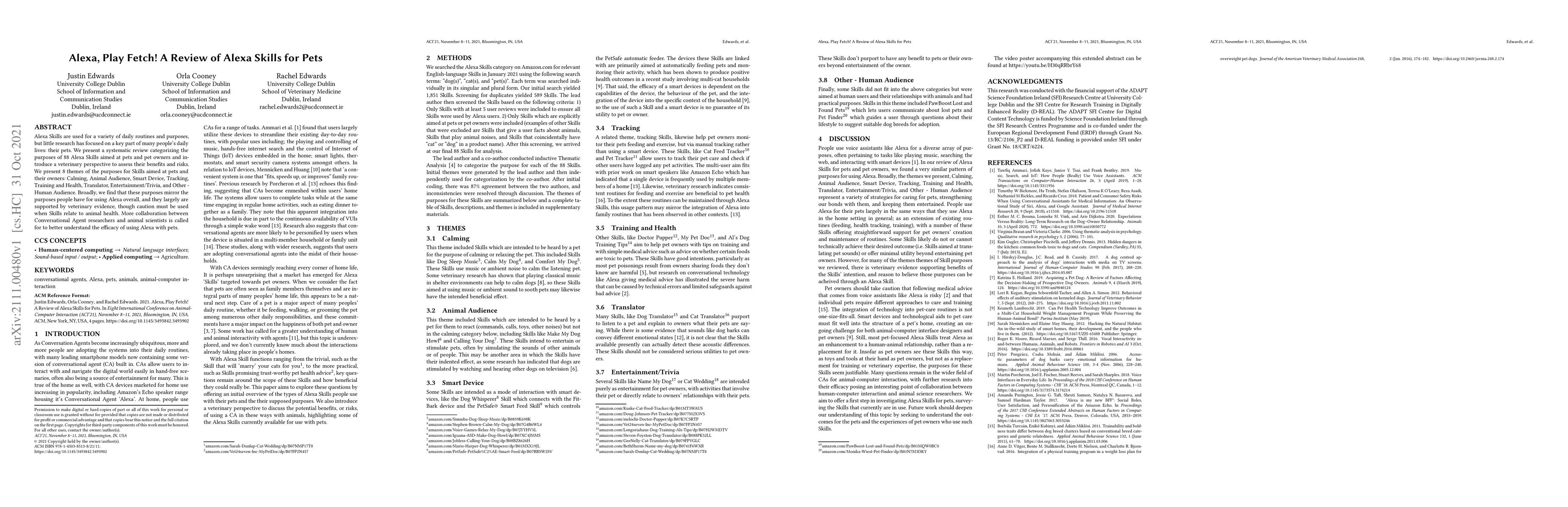 This paper systematically reviews 88 Alexa Skills designed for pets and pet owners, categorizing them into eight themes: Calming, Animal Audience, Smart Device, Tracking, Training and Health, Translator, Entertainment/Trivia, and Other - Human Audience. The study finds that these purposes align with general Alexa uses and are generally supported by veterinary evidence, though caution is advised for health-related Skills. The paper calls for more collaboration between researchers and animal scientists to better evaluate Alexa's efficacy with pets.