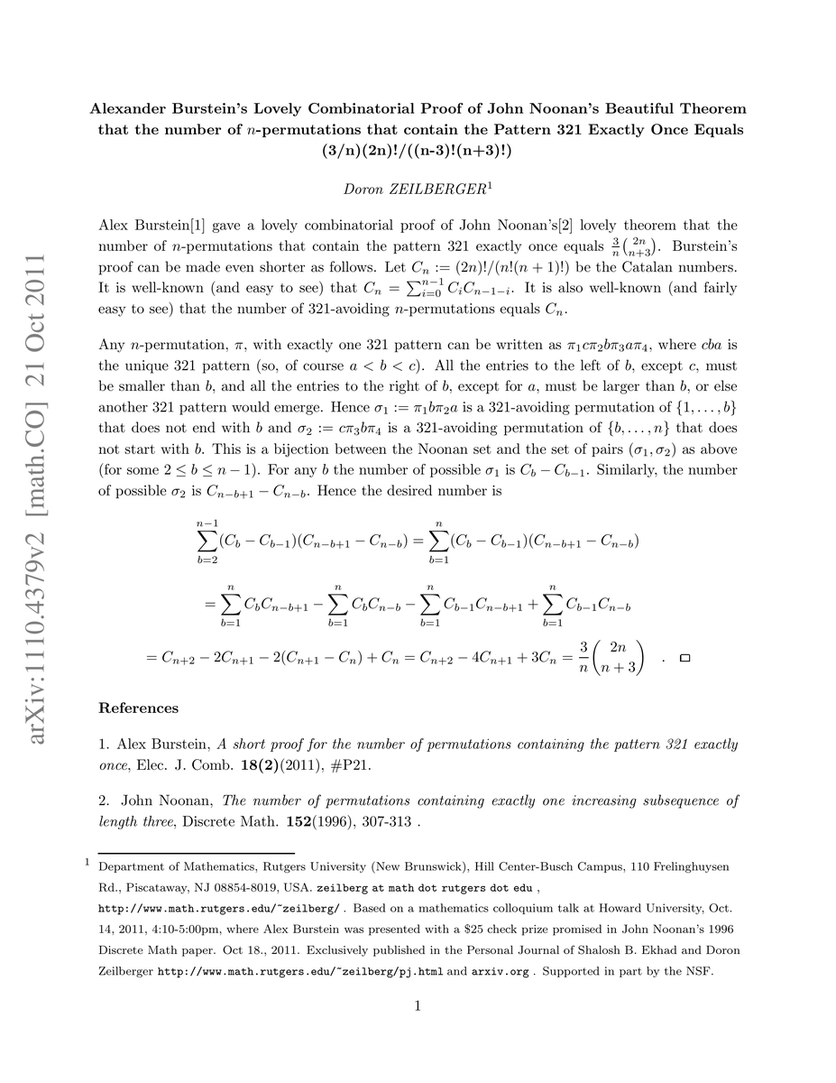 In 1996, my brilliant student John Noonan, discovered, and proved that there are 3(2n)!/(n(n+3)!(n-3)!) ways to line-up n people of different heights in such a way that out of the n(n-1)(n-2)/6 possible triples of people exactly one is such that the tallest stands (not necessarily immediately) in front of the second-tallest, who in turn, stands (not necessarily immediately) in front of the shortest. In that article, I promised a prize of 25 dollars for a nice combinatorial proof. Alex Burstein gave such a proof. On Oct. 14, 2011, I talked about Alex's lovely proof at the Howard U. math colloquium, and publicly presented the 25-dollar prize. The present note is the outcome. Congratulations Alex!